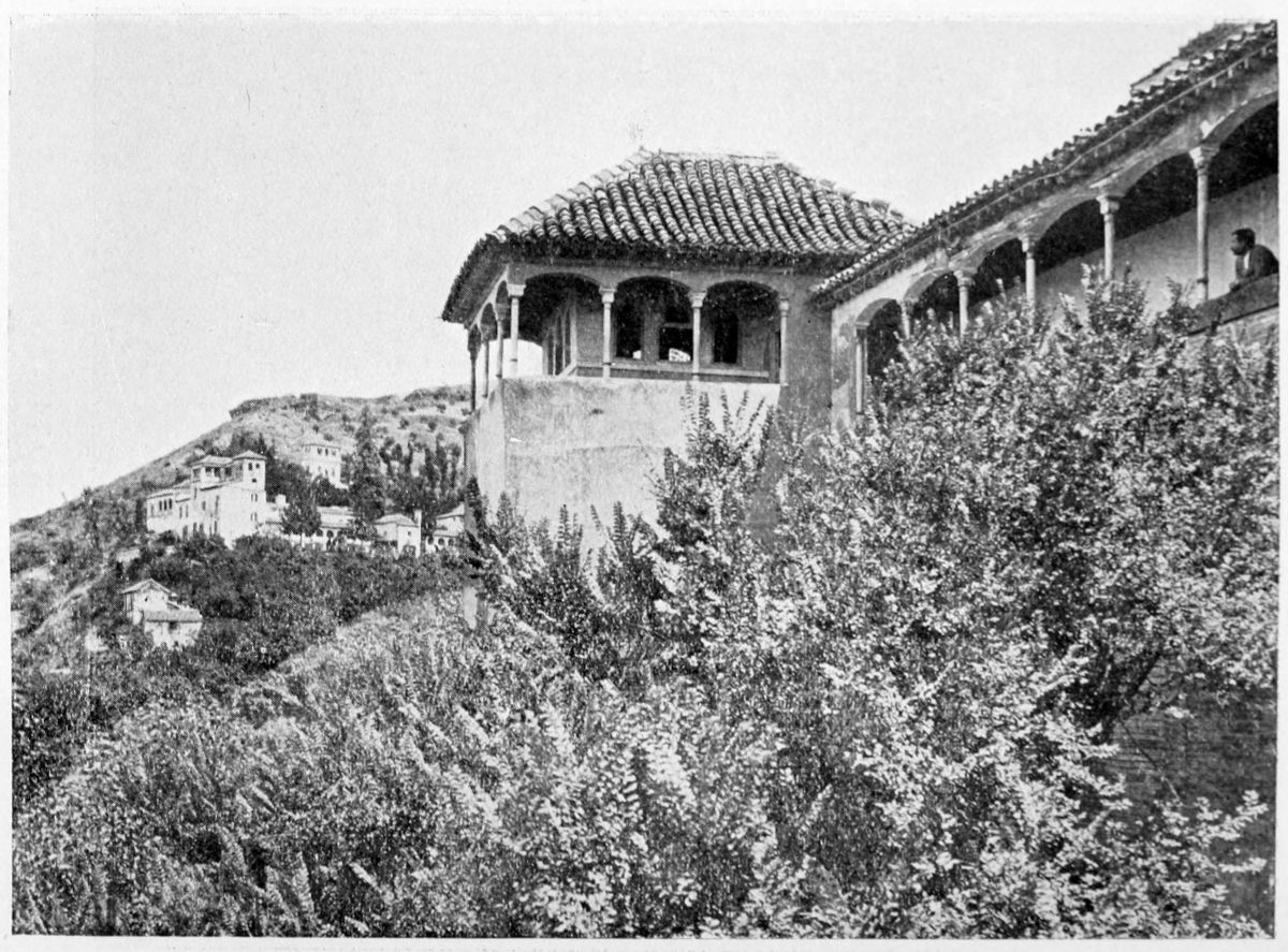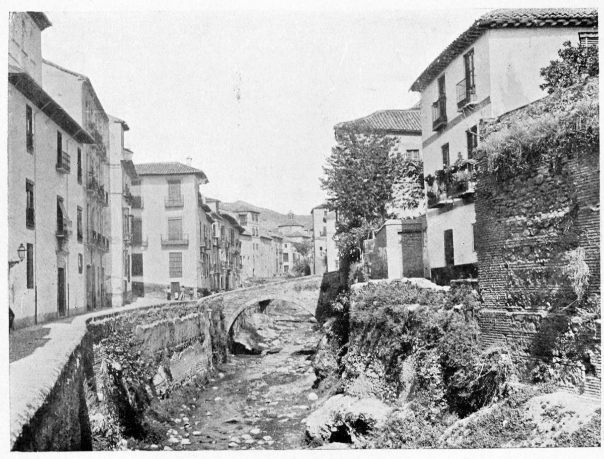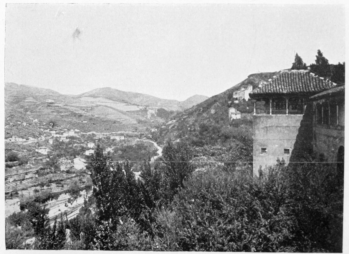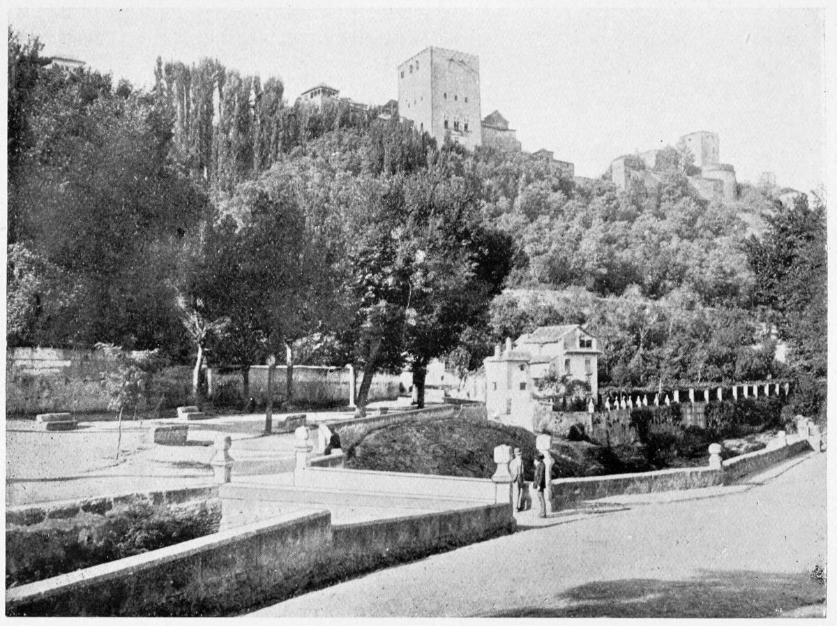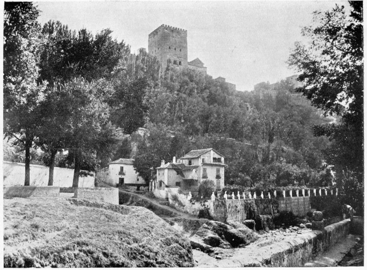 Al Khattíb refers to the Citadel of Granada in these terms: “The southern part of the city is commanded by the suburb of the Alhambra or Medina Alhamra, the court of the sultanate, crowning it with its turrets, its lofty towers, its strong bastions, its magnificent Alcazar, and other sumptuous edifices, which by their splendour{28} ravish the eye and the soul. There is, too, such an abundance of waters that, overflowing in torrents from the tanks and reservoirs, they form on the declivity streams and cascades, whose sonorous murmurs are heard afar on. At the foot of the walls are spacious gardens, the domain of the Sultan, and leafy groves, through the dense greenery of which the white battlements gleam like stars. There is, in short, around the circuit of the walls, no spot that is not planted with gardens and orchards.” The scene has not greatly changed since the Arab wrote. Gurgling brooks still run down the slopes of the Alhambra Hill, and nightingales sing in the thick woods of elm.
