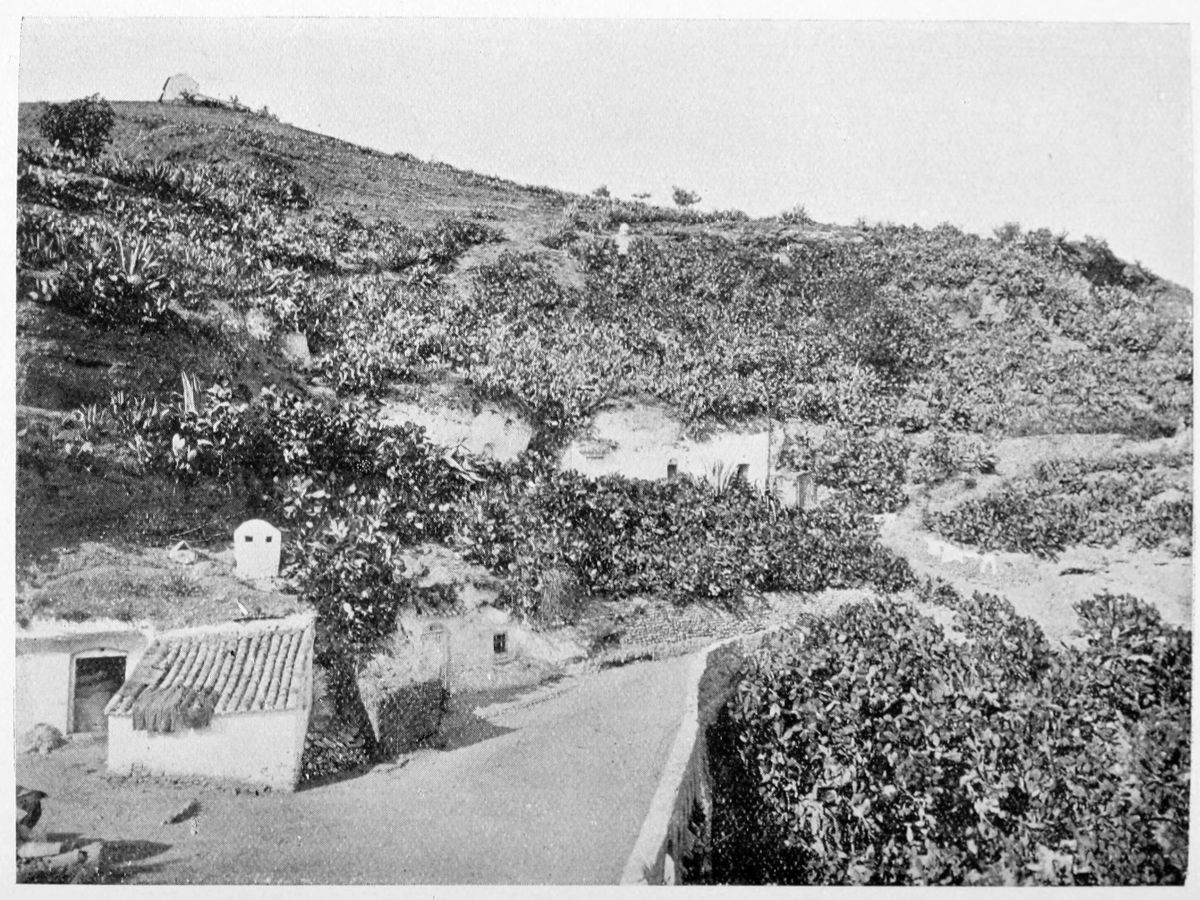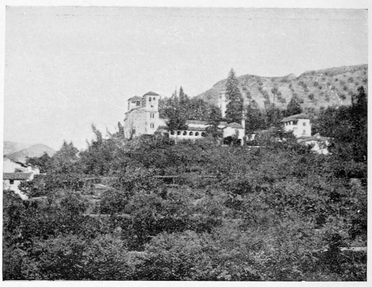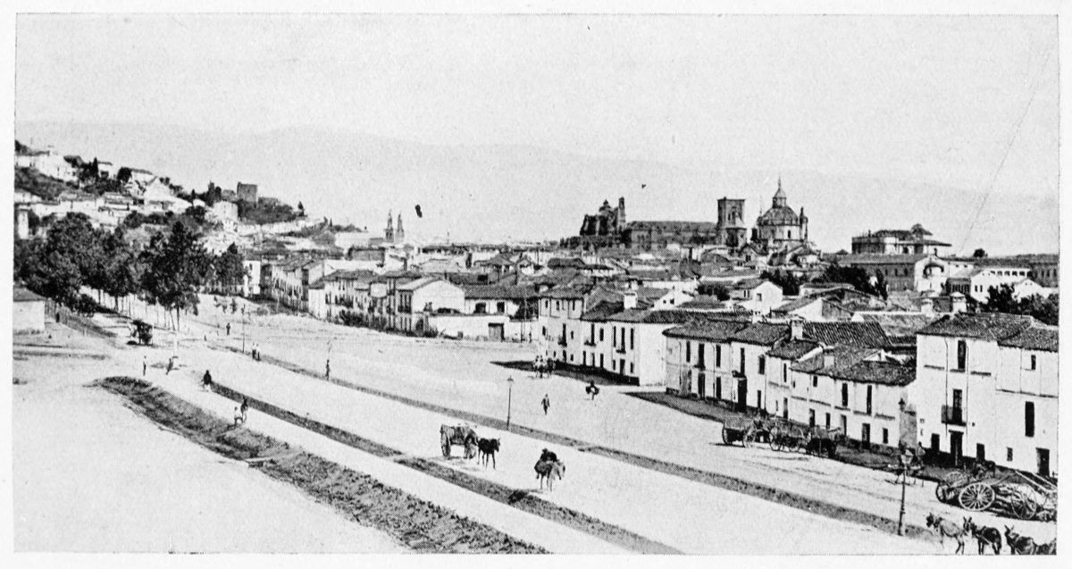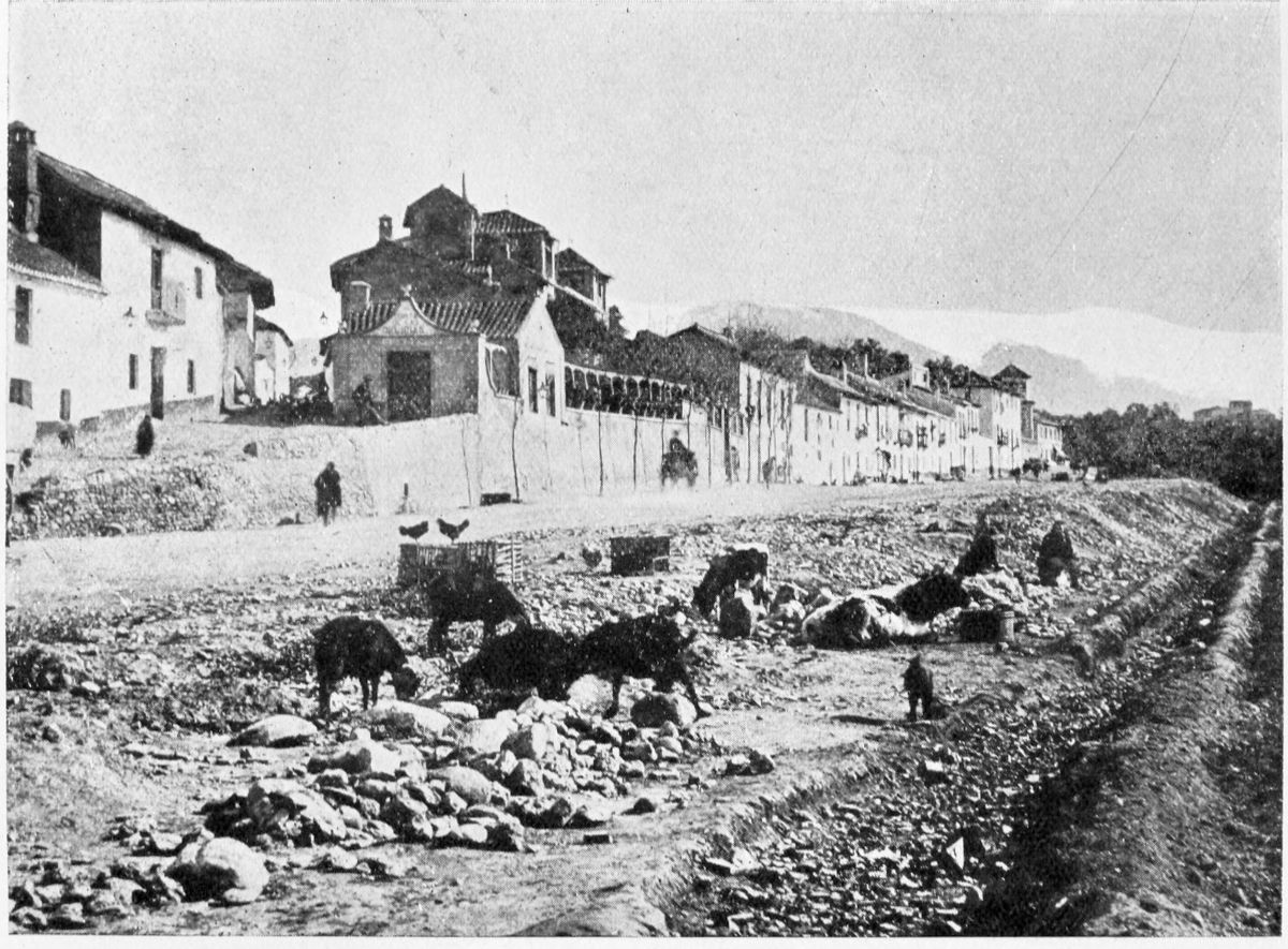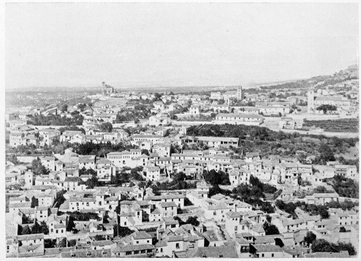 Al Khattíb refers to the Citadel of Granada in these terms: “The southern part of the city is commanded by the suburb of the Alhambra or Medina Alhamra, the court of the sultanate, crowning it with its turrets, its lofty towers, its strong bastions, its magnificent Alcazar, and other sumptuous edifices, which by their splendour{28} ravish the eye and the soul. There is, too, such an abundance of waters that, overflowing in torrents from the tanks and reservoirs, they form on the declivity streams and cascades, whose sonorous murmurs are heard afar on. At the foot of the walls are spacious gardens, the domain of the Sultan, and leafy groves, through the dense greenery of which the white battlements gleam like stars. There is, in short, around the circuit of the walls, no spot that is not planted with gardens and orchards.” The scene has not greatly changed since the Arab wrote. Gurgling brooks still run down the slopes of the Alhambra Hill, and nightingales sing in the thick woods of elm.