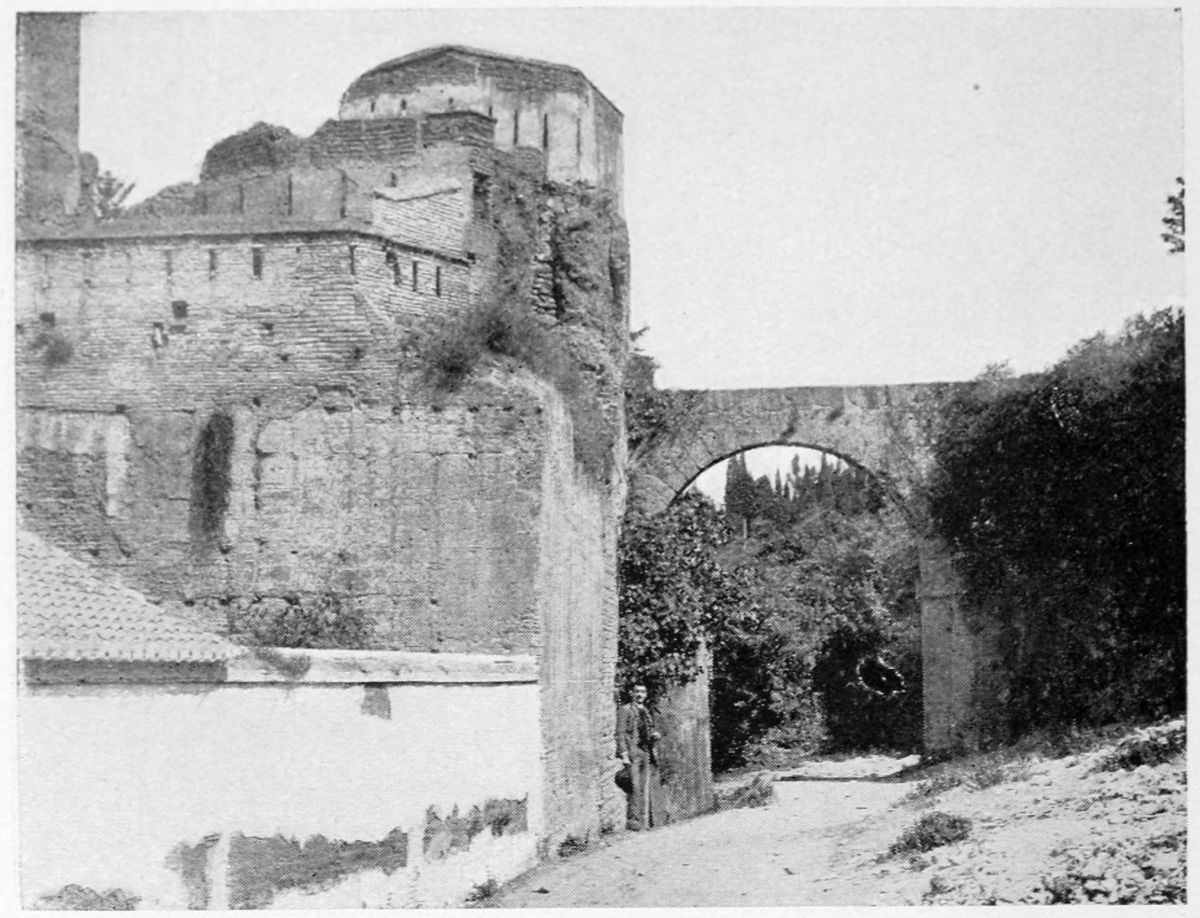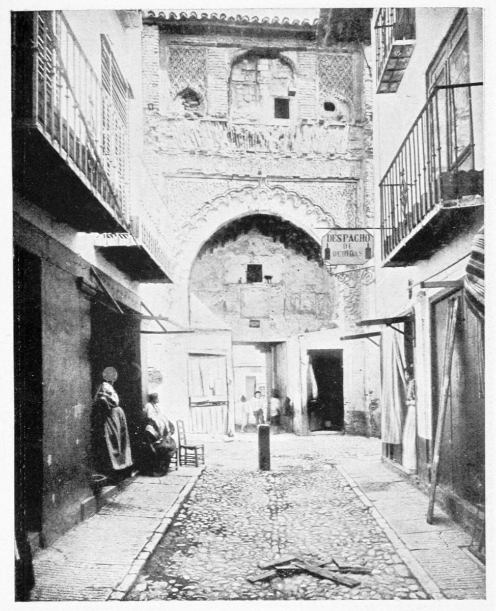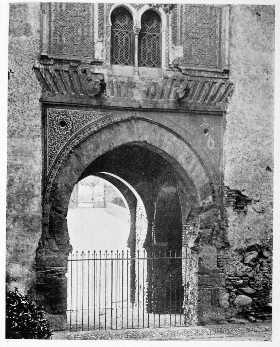 The Alcazaba, according to the most recent researches, was separated from the site of the{30} palace by a ravine where, after the Conquest, cisterns were constructed by order of the Conde de Tendilla and over which the existing Plaza de los Algibes was formed. These works appear to have necessitated the demolition of a wall which ran across from the Torre de las Gallinas on the north to the beautiful Puerta del Vino on the south. This gateway is now quite isolated from the wall of circumvallation. Over the horseshoe arch is an inscription in stucco, of the usual Moorish character, invoking the Divine protection for the builder, Sultan Mohammed V. It appears to commemorate some striking victory. Over the arch again is a fine double window or ajimez. On the keystone is seen the key, so often figuring as a symbol in all parts of the Alhambra, with a G in Kufic characters—perhaps the initial letter of the city. The interior façade has a large horseshoe arch and the twin-windows above. The Puerta del Vino was probably the entrance to the courts and gardens of the palace.