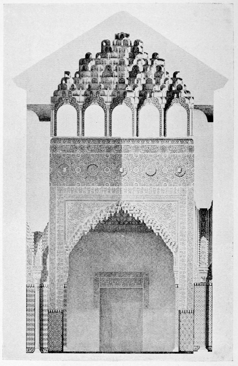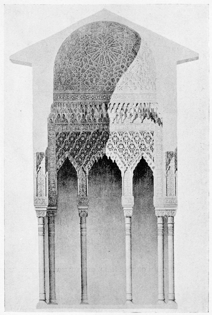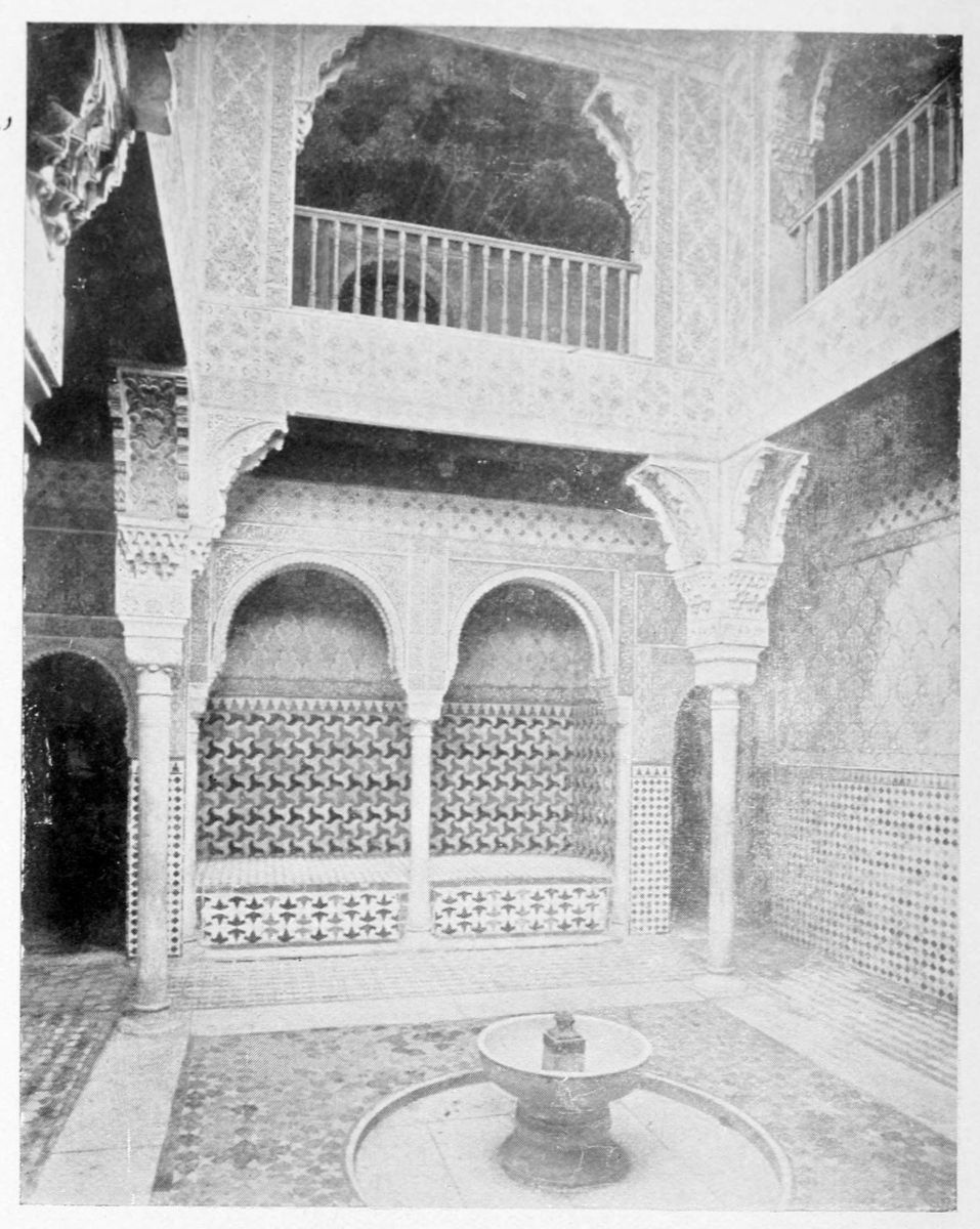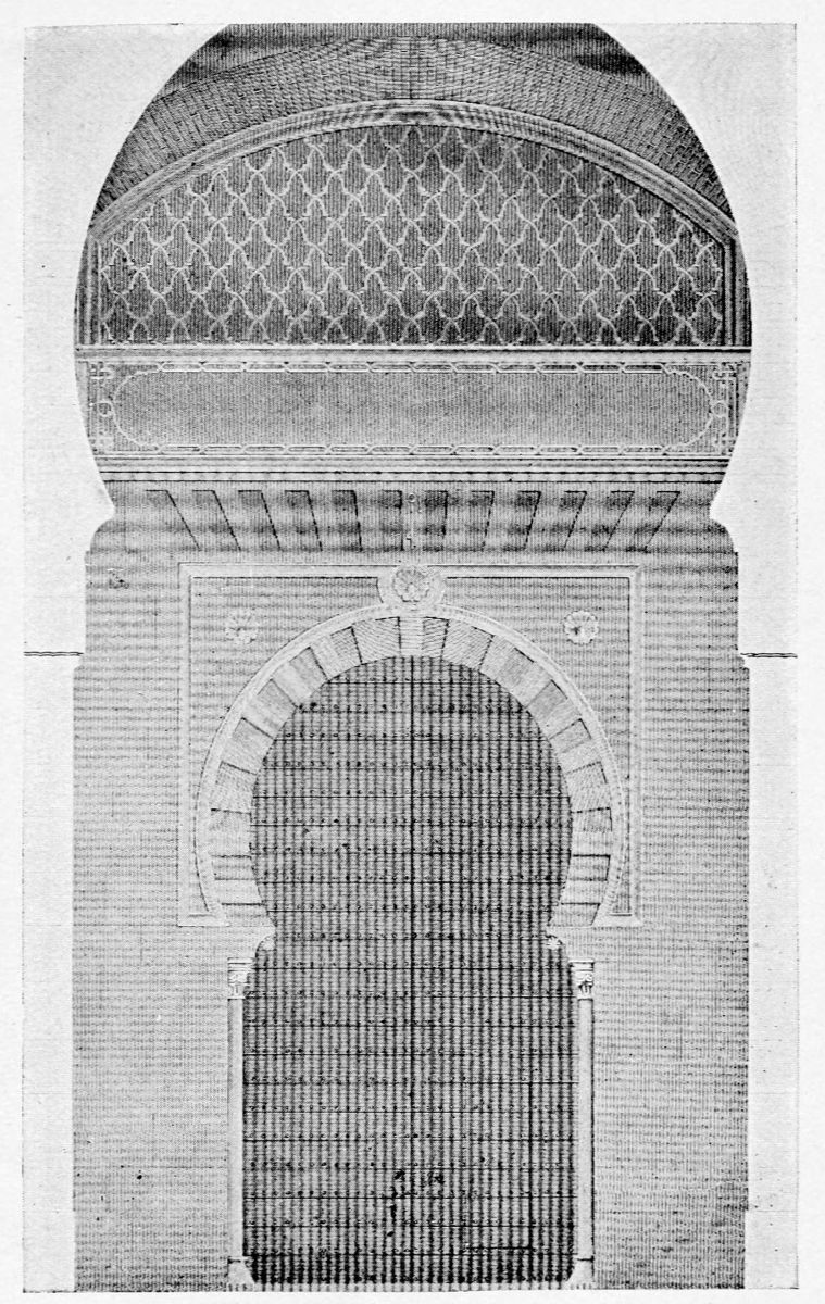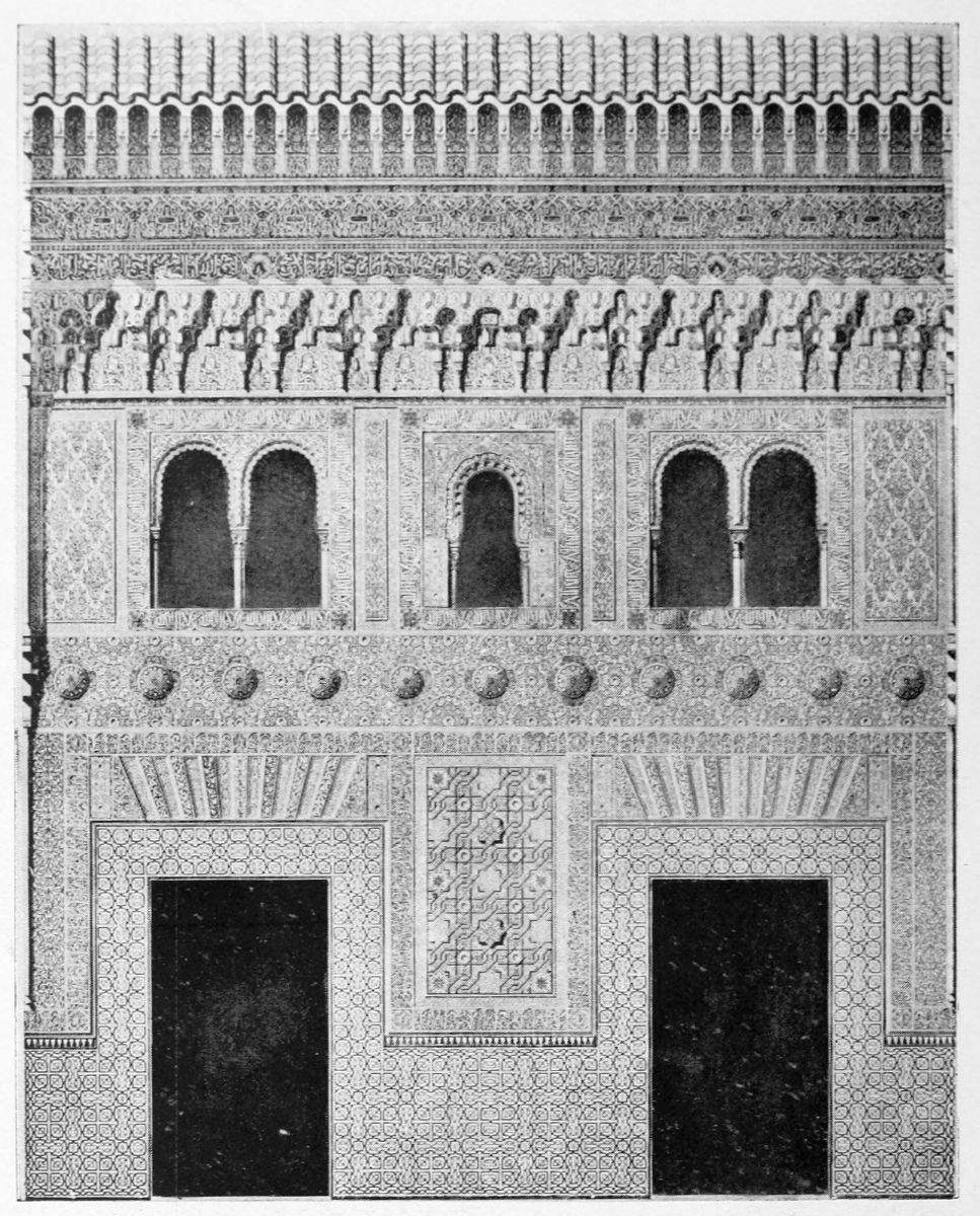 On the general plan of the edifice, the remarks of Contreras are worth quoting in extenso: “We penetrate into every Arabic monument through an outlying tower, or between two towers, except{33} in the dwelling-houses of the people, in which case the entrance is by a small, square opening, a portal useless among us, though seen with frequency in the ancient houses of Andalusia. A long, narrow hall cuts the axis perpendicularly, thus determining the distribution into two wings of the edifice. By the meeting of the two axes is found the entrance, before which we find those effects of perspective which are so fantastic in these buildings. Following the ingress we find a court with tanks and fountains, with light and graceful arcades. Behind the second gallery, following the same central axis, are oblong naves which cross each other at right angles to the extreme end of the building, where the cupolas or turrets of the innermost dwelling apartments rise majestically above the level of the edifice and are reflected in the waters of the basins. The halls of a house of this kind, according to its rank or grandeur, were arranged in little pavilions on the long sides of the courts, as various in their style of decoration as the tents of a Turkish camp, where the quarters of an Amir may be found beside those of the common soldiers. And if these rows of chambers are now found disposed according to the strict alignment of Mudejar eaves, it is an indication that the severe genius of the Christian conquerors has transformed them, not permitting those crests, cupolas, or{34} steeples which disturb the symmetry of the decoration.