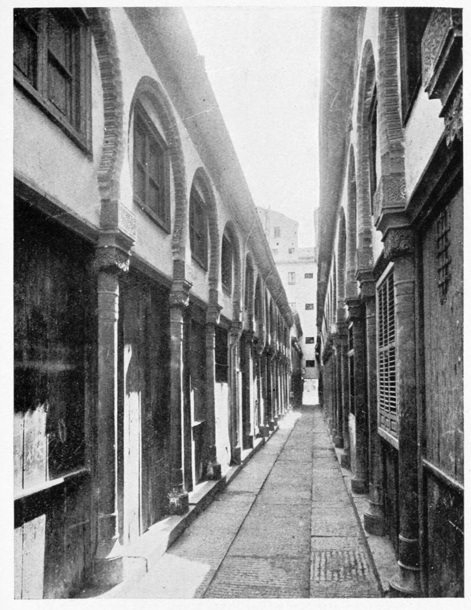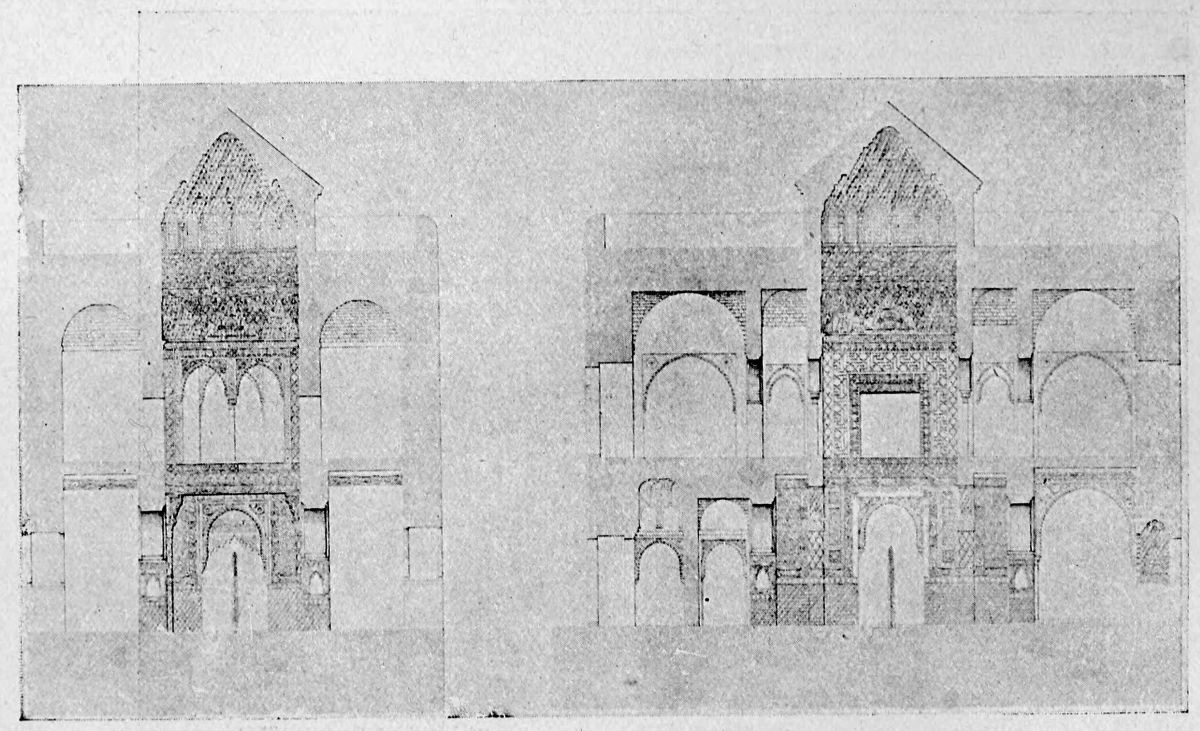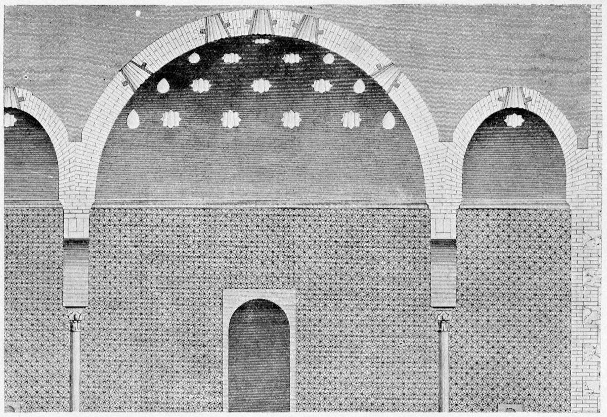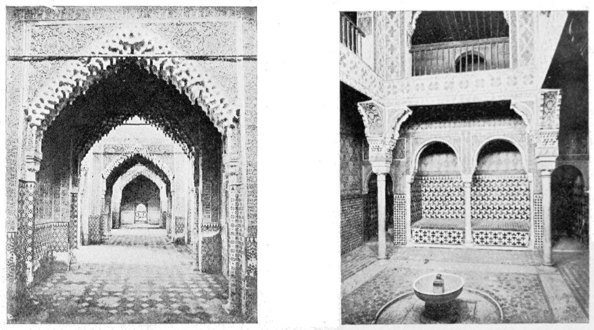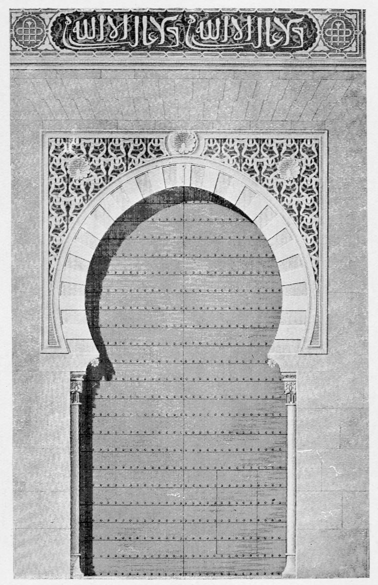 On the general plan of the edifice, the remarks of Contreras are worth quoting in extenso: “We penetrate into every Arabic monument through an outlying tower, or between two towers, except{33} in the dwelling-houses of the people, in which case the entrance is by a small, square opening, a portal useless among us, though seen with frequency in the ancient houses of Andalusia. A long, narrow hall cuts the axis perpendicularly, thus determining the distribution into two wings of the edifice. By the meeting of the two axes is found the entrance, before which we find those effects of perspective which are so fantastic in these buildings. Following the ingress we find a court with tanks and fountains, with light and graceful arcades. Behind the second gallery, following the same central axis, are oblong naves which cross each other at right angles to the extreme end of the building, where the cupolas or turrets of the innermost dwelling apartments rise majestically above the level of the edifice and are reflected in the waters of the basins. The halls of a house of this kind, according to its rank or grandeur, were arranged in little pavilions on the long sides of the courts, as various in their style of decoration as the tents of a Turkish camp, where the quarters of an Amir may be found beside those of the common soldiers. And if these rows of chambers are now found disposed according to the strict alignment of Mudejar eaves, it is an indication that the severe genius of the Christian conquerors has transformed them, not permitting those crests, cupolas, or{34} steeples which disturb the symmetry of the decoration.