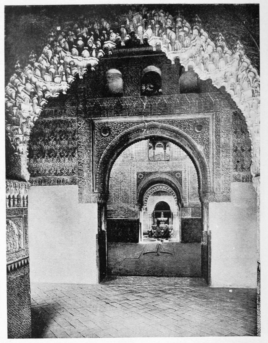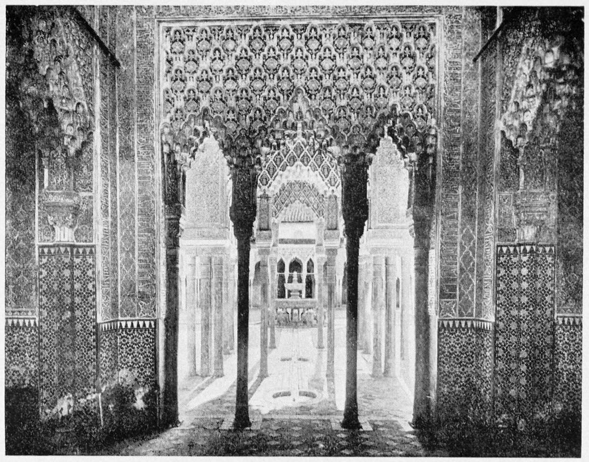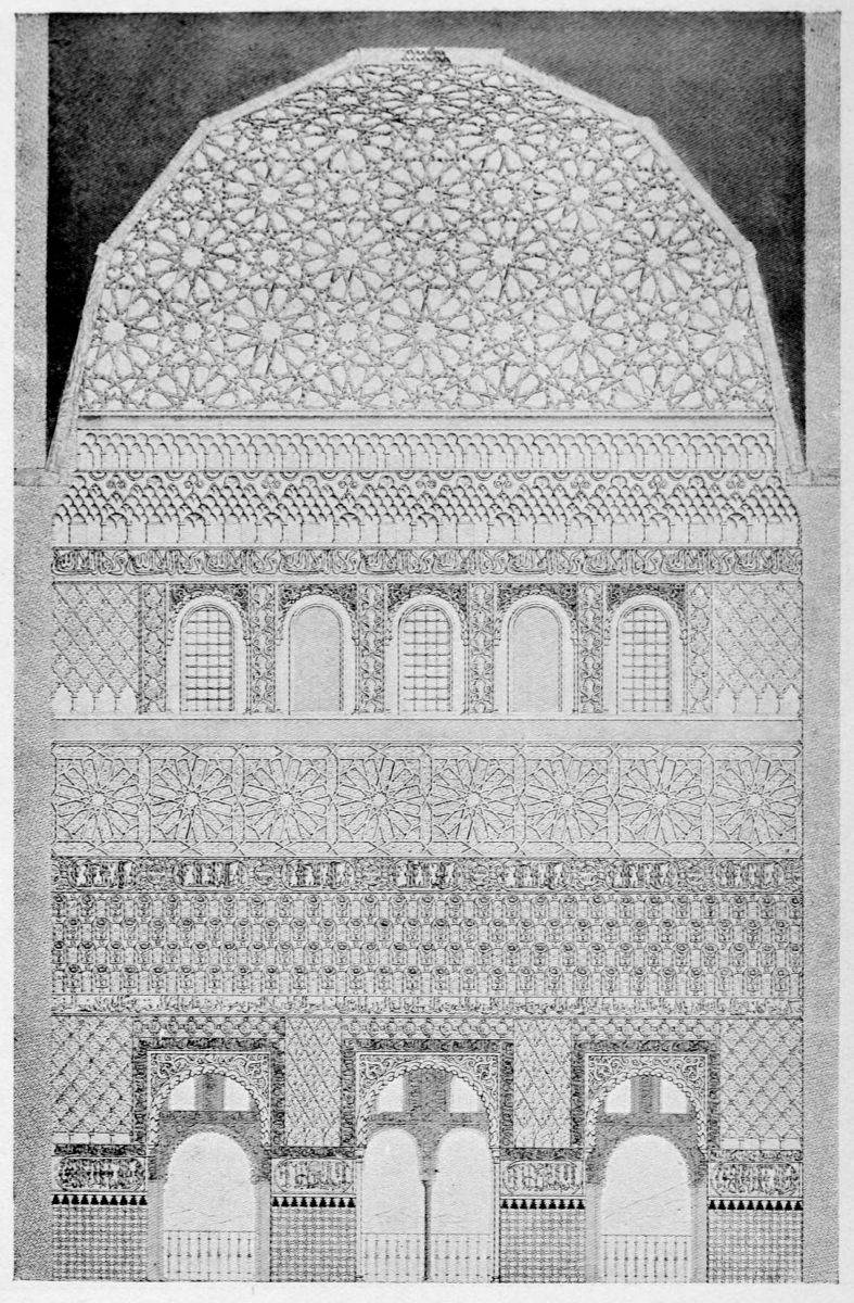 We pass through a beautiful arch decorated with tasteful floral designs, into the Sala de la Barca, or ante-room of the Hall of Ambassadors. This fine apartment, formerly radiant with colours, was seriously damaged in the fire of 1890. The ceiling of this hall, says Owen Jones, “is a wagon-headed dome of wood of the most elaborate{42} patterns, receiving its support from pendentives of mathematical construction so curious that they may be rendered susceptible of combinations as various as the melodies which may be produced from the seven notes of the musical scale; attesting the wonderful power and effect obtained by the repetition of the most simple elements.”