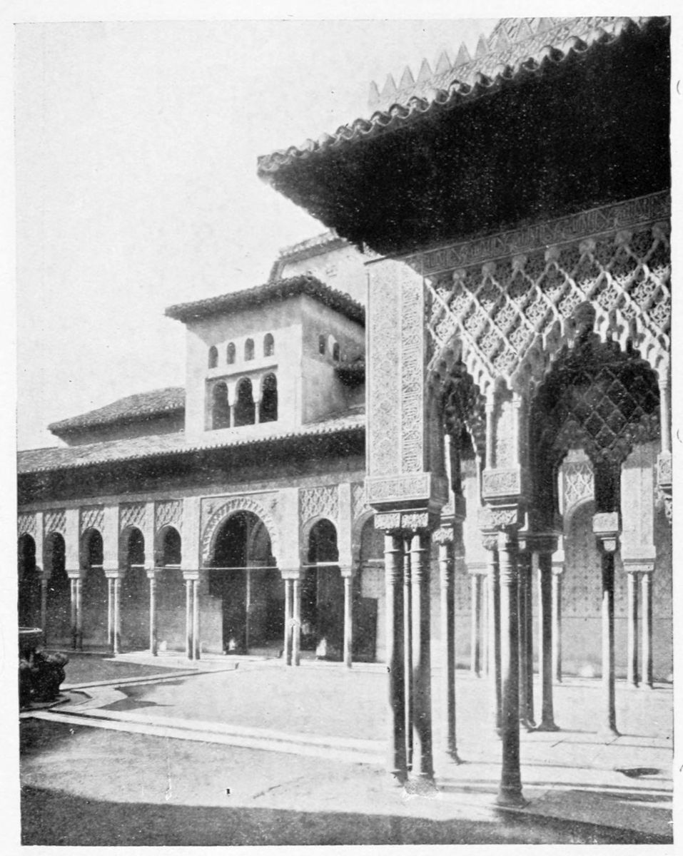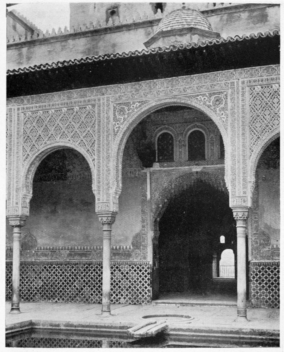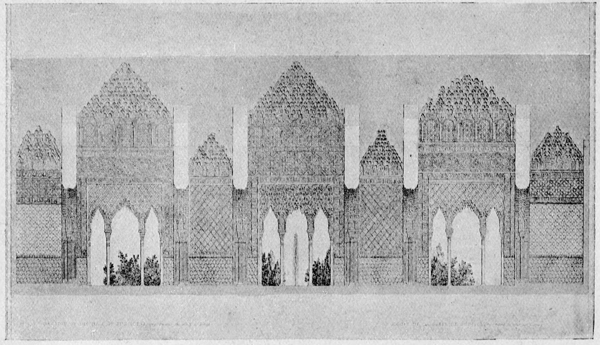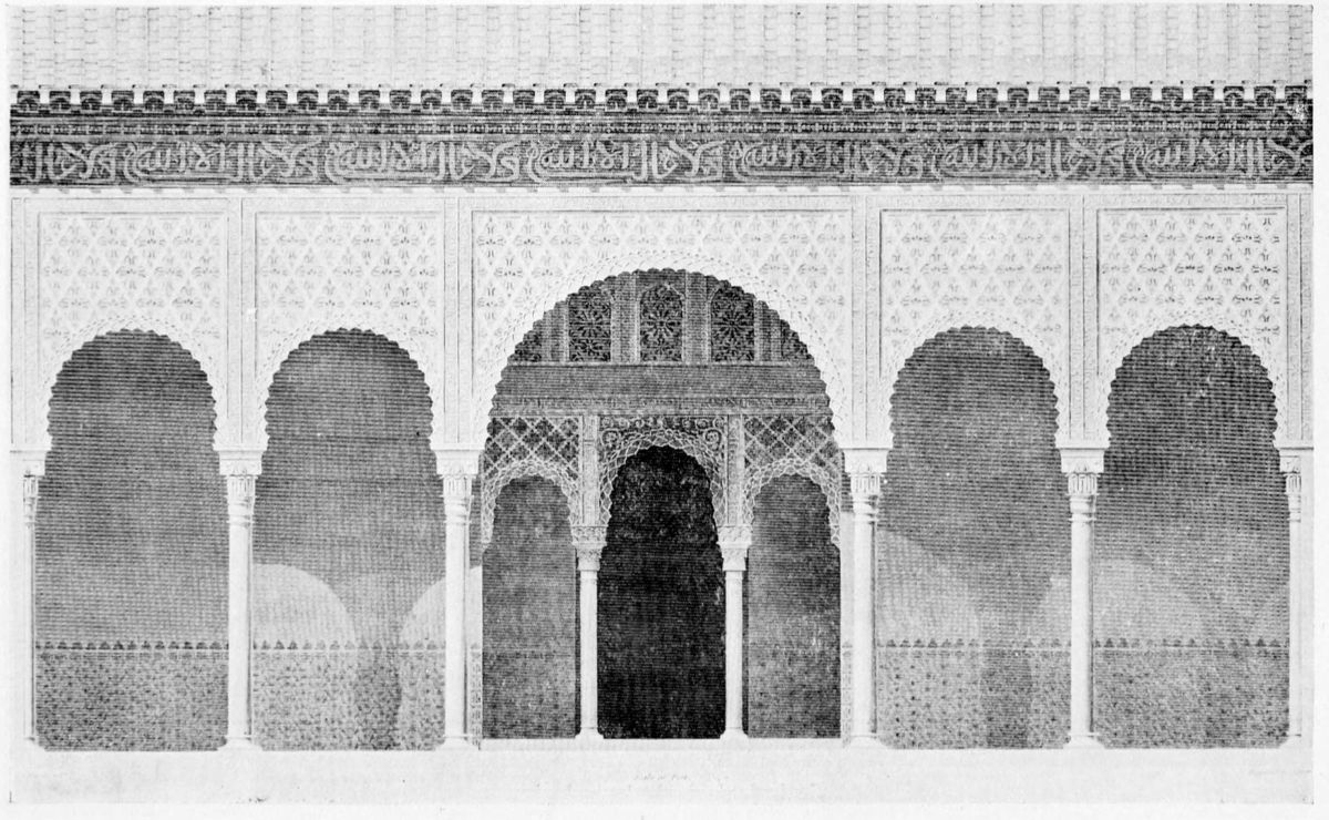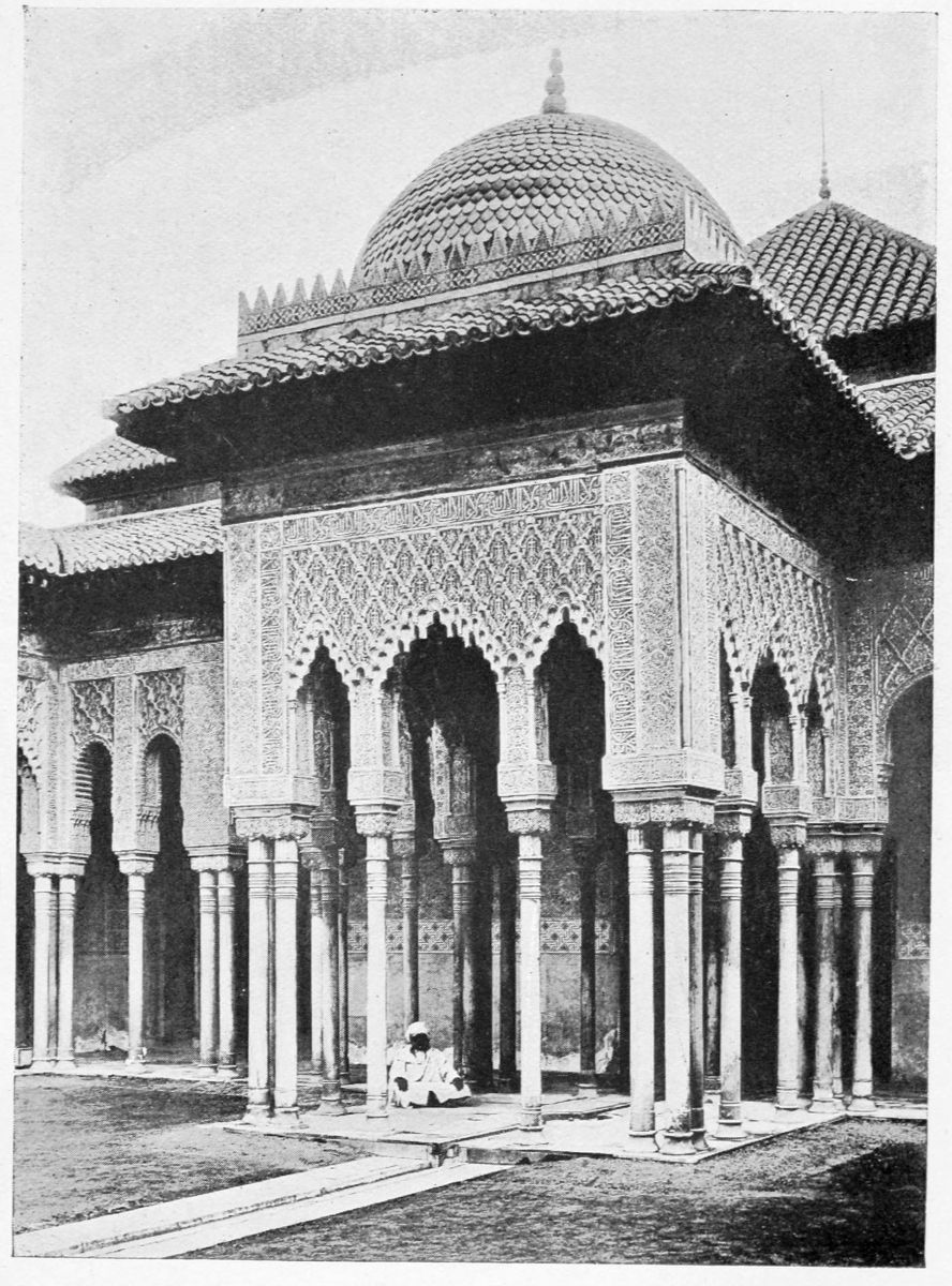 Don Mariano Contreras, Conservator of the Alhambra, the son of the gifted Raphaël Contreras, who devoted thirty-seven years of his life to the restoration of the Palace—gave me the benefit of his knowledge of this unique treasure-house of art; and I have also laid under contribution the beautiful plates of Owen Jones, who disposed of a Welsh inheritance in order to produce his great work on the Plans, Elevations, Sections, and Details of the Alhambra. Jones’s Grammar of Ornament, which has been described as “beautiful enough to be the horn-book of the Angels,” also contains the result of his researches in the Alhambra, which occupied him for the greater part of eleven years. A selection of these illustrations is here rescued from the obscurity of public libraries and the inaccessible fastnesses of private collections. The inclusion of John F. Lewis’s drawings, and the reproduction of a series of pictures by James C. Murphy, who spent seven years in the study of the artistic marvels of the Alhambra, I do not feel called upon to defend.{x} The photographs, several of which were placed at my disposal by Don Rafaël Garzón, represent the buildings as they appear to-day; the drawings were made before the Palace was damaged by the disastrous fire of September, 1890.