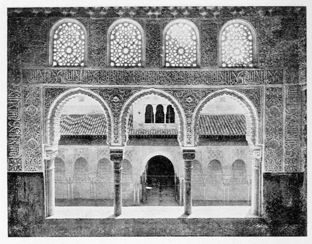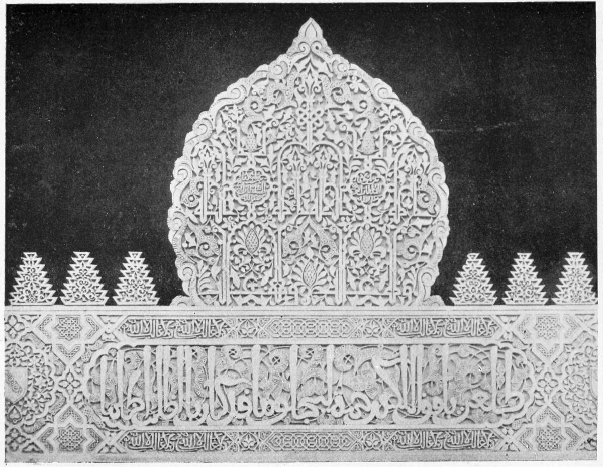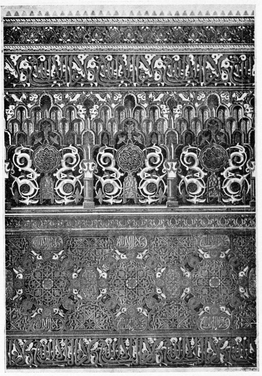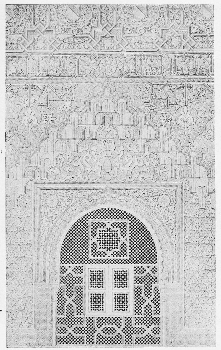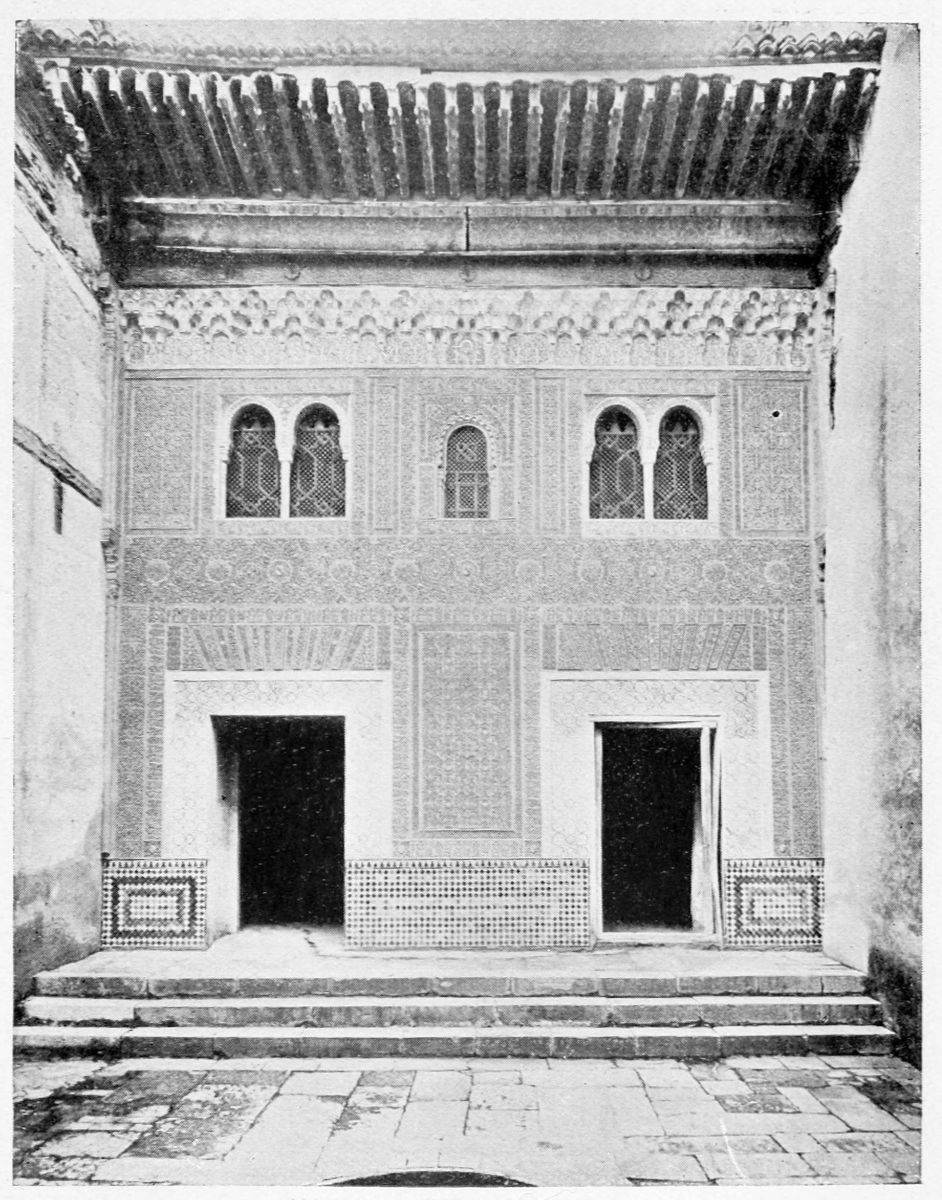 The chapel, which had been established by Ferdinand and Isabel adjacent to the Patio de los Leones, was transferred to this part of the Palace of Philip IV. in 1621. At that time a fine chimney-piece in the Renaissance style was converted into an altar. The apartment contains but few remains of its Moorish builders. Without, is the Patio de la Mezquita, with an exquisite{38} façade, much disfigured by a modern gallery. The walls are adorned with the oft-recurring device, “God alone is Conqueror,” and with sentences extolling the sultans, in various sorts of arabesques. The inscription round the central window refers to Mohammed V. (1354-1391).