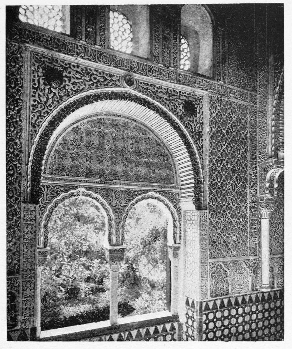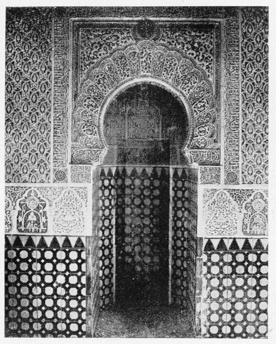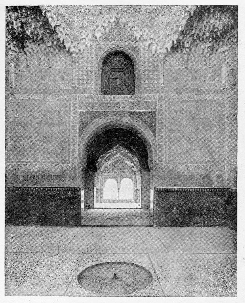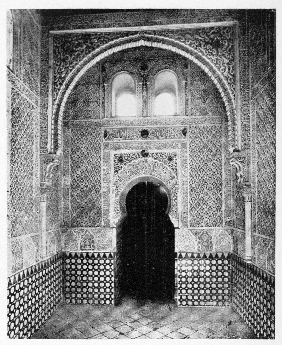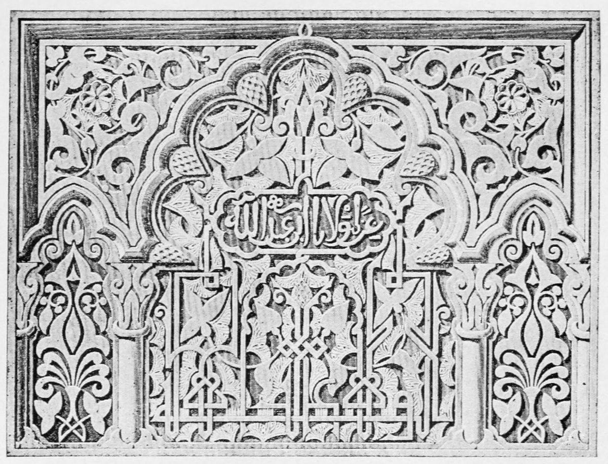 The chapel, which had been established by Ferdinand and Isabel adjacent to the Patio de los Leones, was transferred to this part of the Palace of Philip IV. in 1621. At that time a fine chimney-piece in the Renaissance style was converted into an altar. The apartment contains but few remains of its Moorish builders. Without, is the Patio de la Mezquita, with an exquisite{38} façade, much disfigured by a modern gallery. The walls are adorned with the oft-recurring device, “God alone is Conqueror,” and with sentences extolling the sultans, in various sorts of arabesques. The inscription round the central window refers to Mohammed V. (1354-1391).