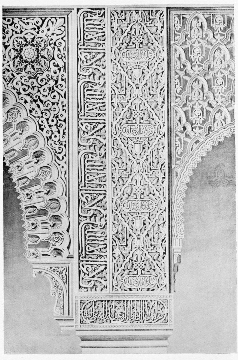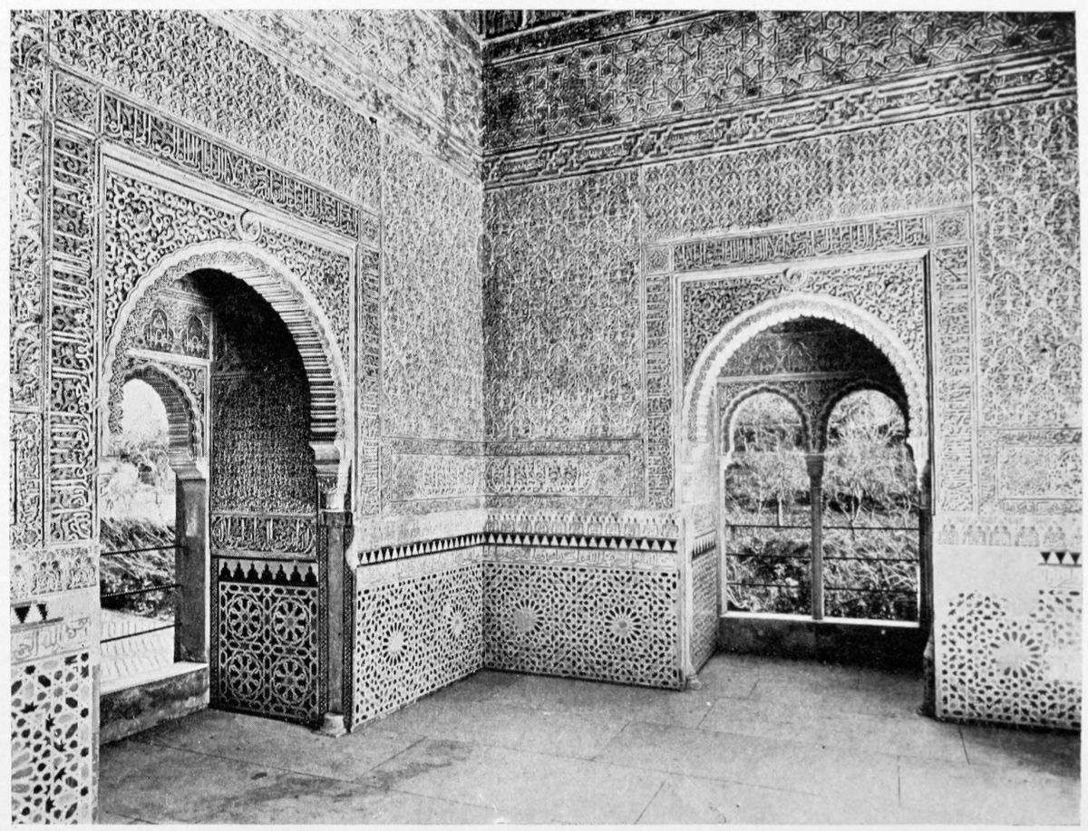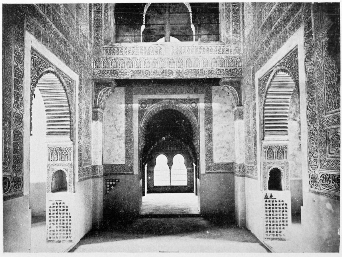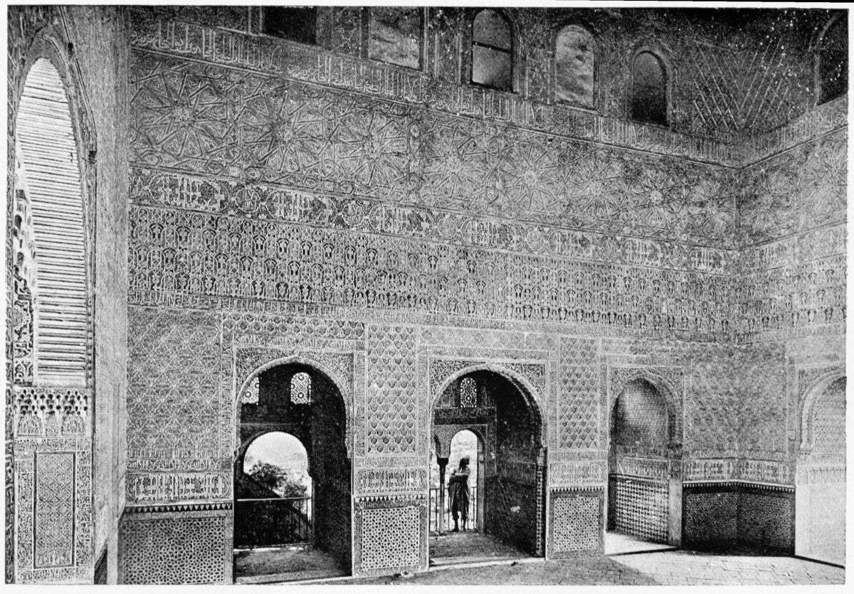The chapel, which had been established by Ferdinand and Isabel adjacent to the Patio de los Leones, was transferred to this part of the Palace of Philip IV. in 1621. At that time a fine chimney-piece in the Renaissance style was converted into an altar. The apartment contains but few remains of its Moorish builders. Without, is the Patio de la Mezquita, with an exquisite{38} façade, much disfigured by a modern gallery. The walls are adorned with the oft-recurring device, “God alone is Conqueror,” and with sentences extolling the sultans, in various sorts of arabesques. The inscription round the central window refers to Mohammed V. (1354-1391).