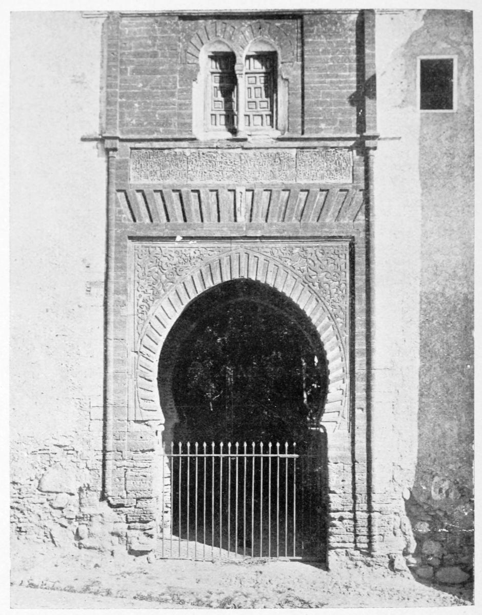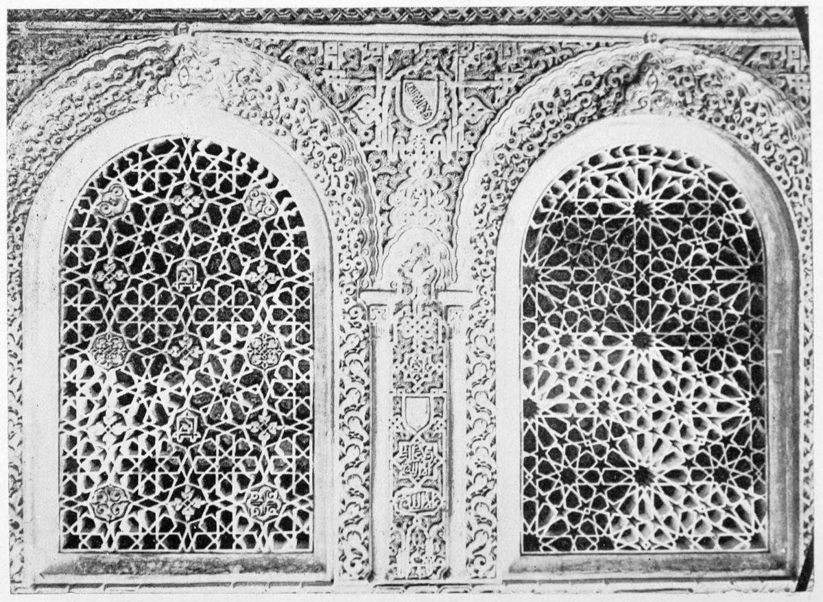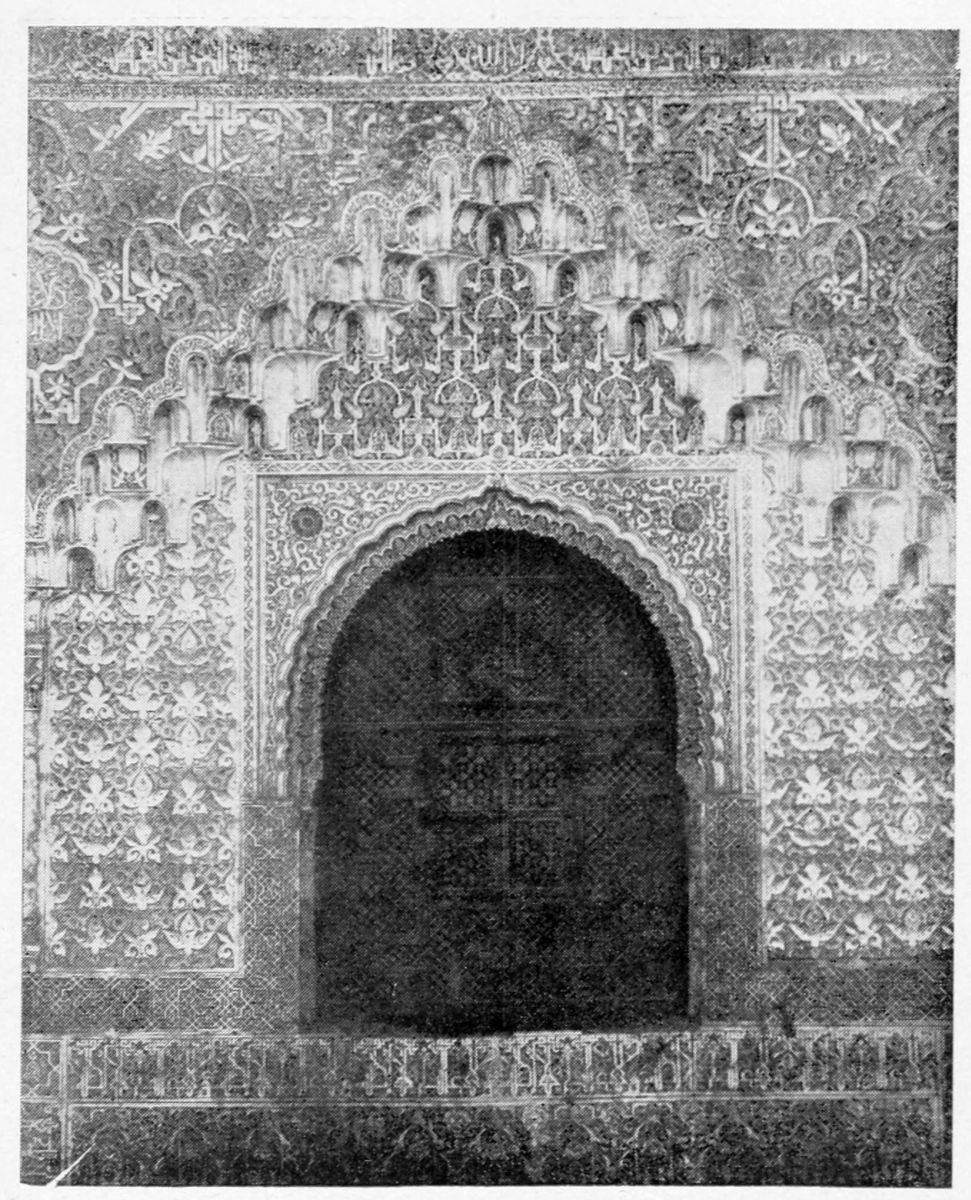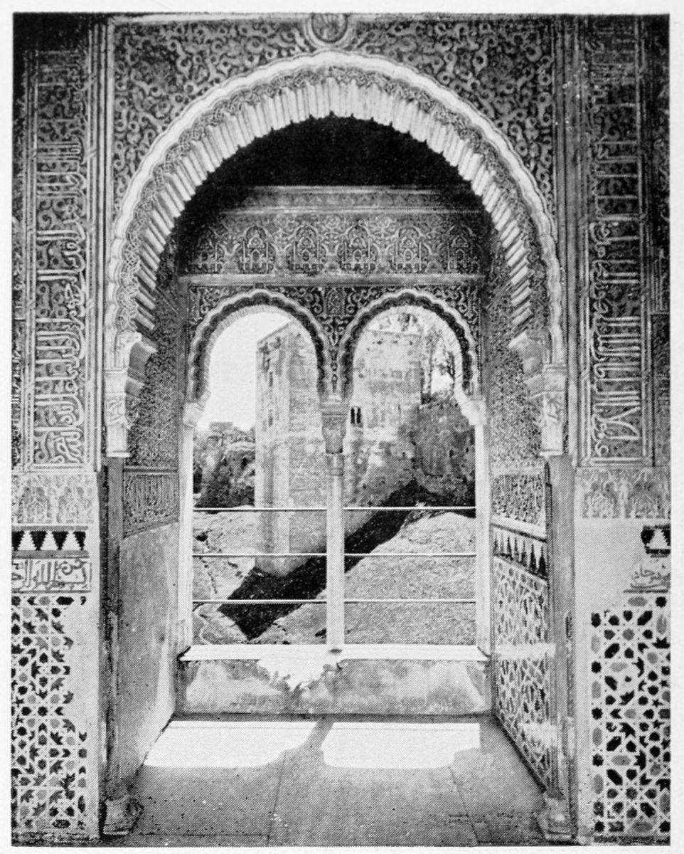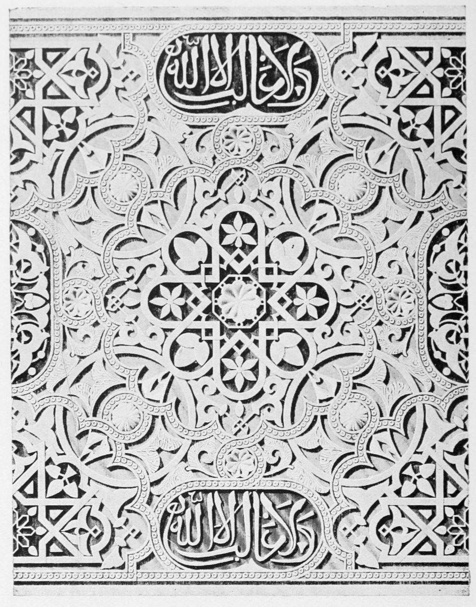 The chapel, which had been established by Ferdinand and Isabel adjacent to the Patio de los Leones, was transferred to this part of the Palace of Philip IV. in 1621. At that time a fine chimney-piece in the Renaissance style was converted into an altar. The apartment contains but few remains of its Moorish builders. Without, is the Patio de la Mezquita, with an exquisite{38} façade, much disfigured by a modern gallery. The walls are adorned with the oft-recurring device, “God alone is Conqueror,” and with sentences extolling the sultans, in various sorts of arabesques. The inscription round the central window refers to Mohammed V. (1354-1391).
