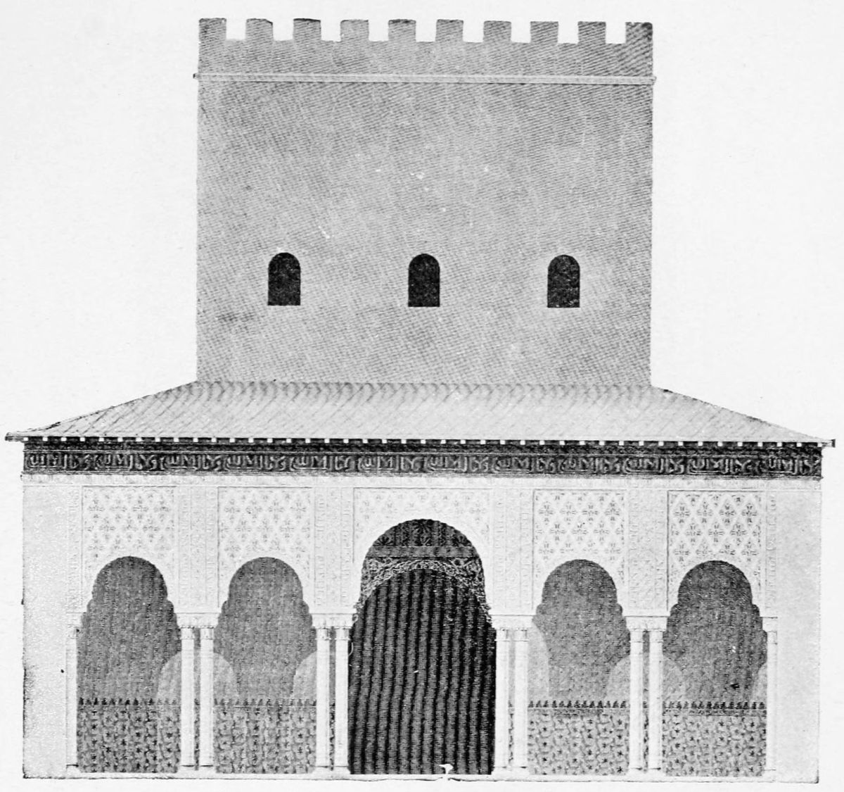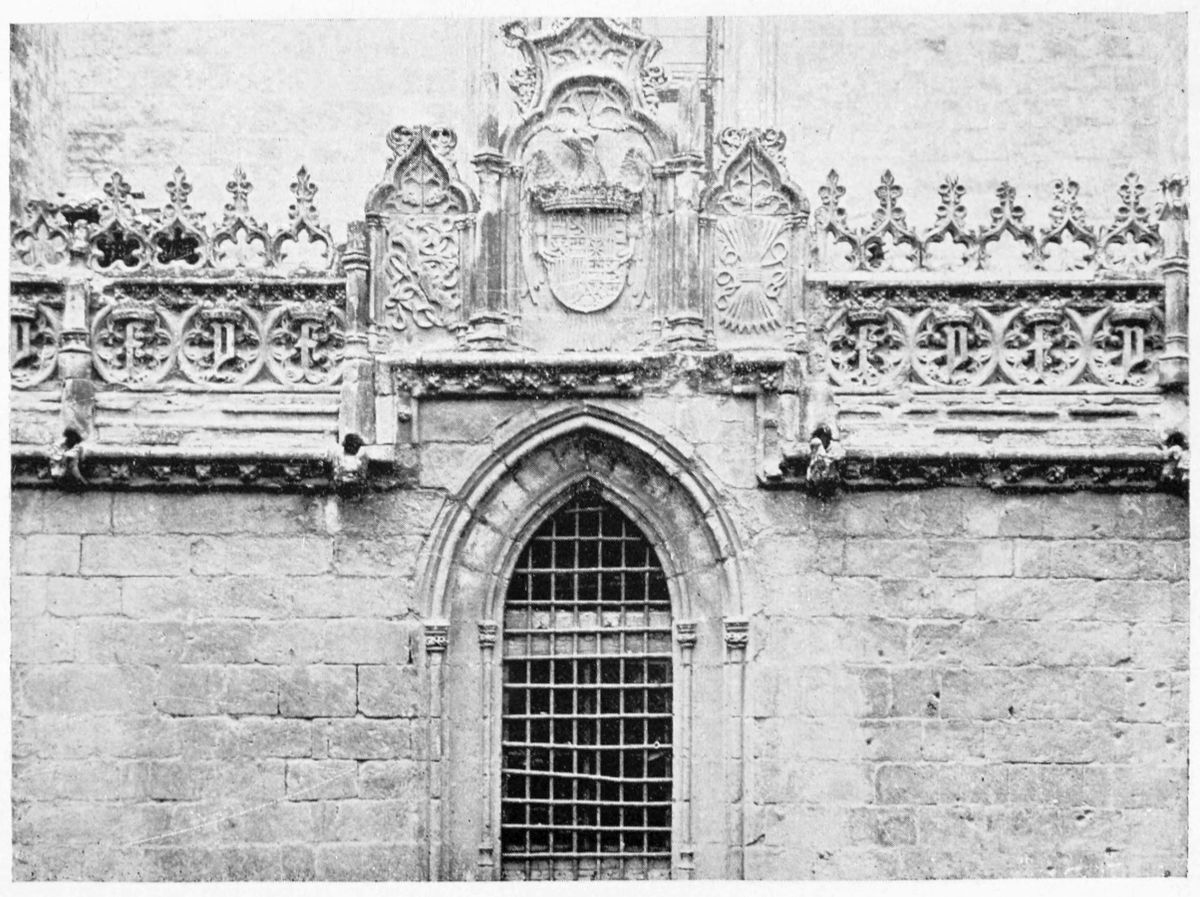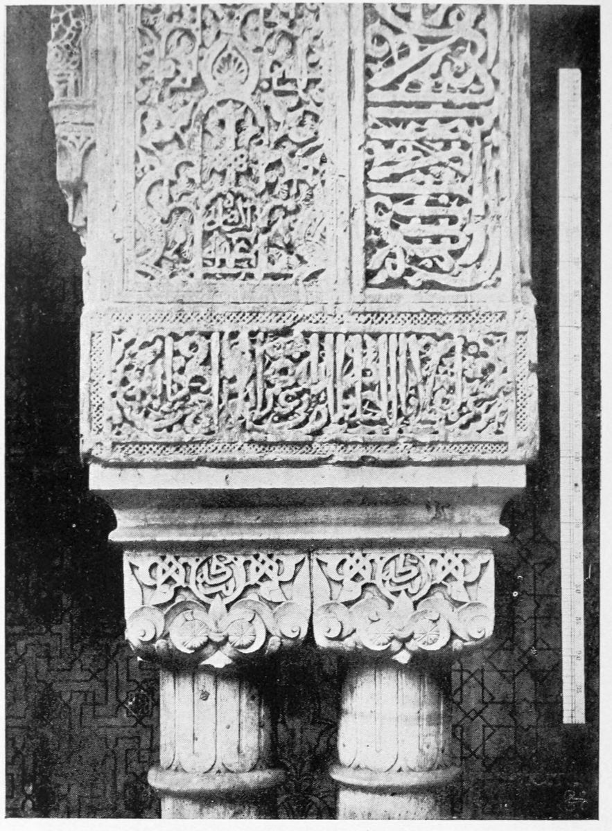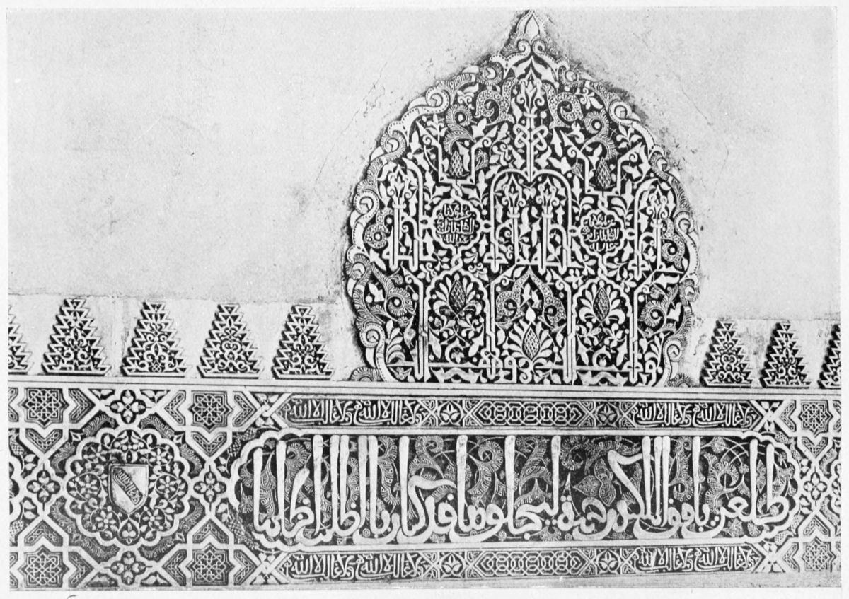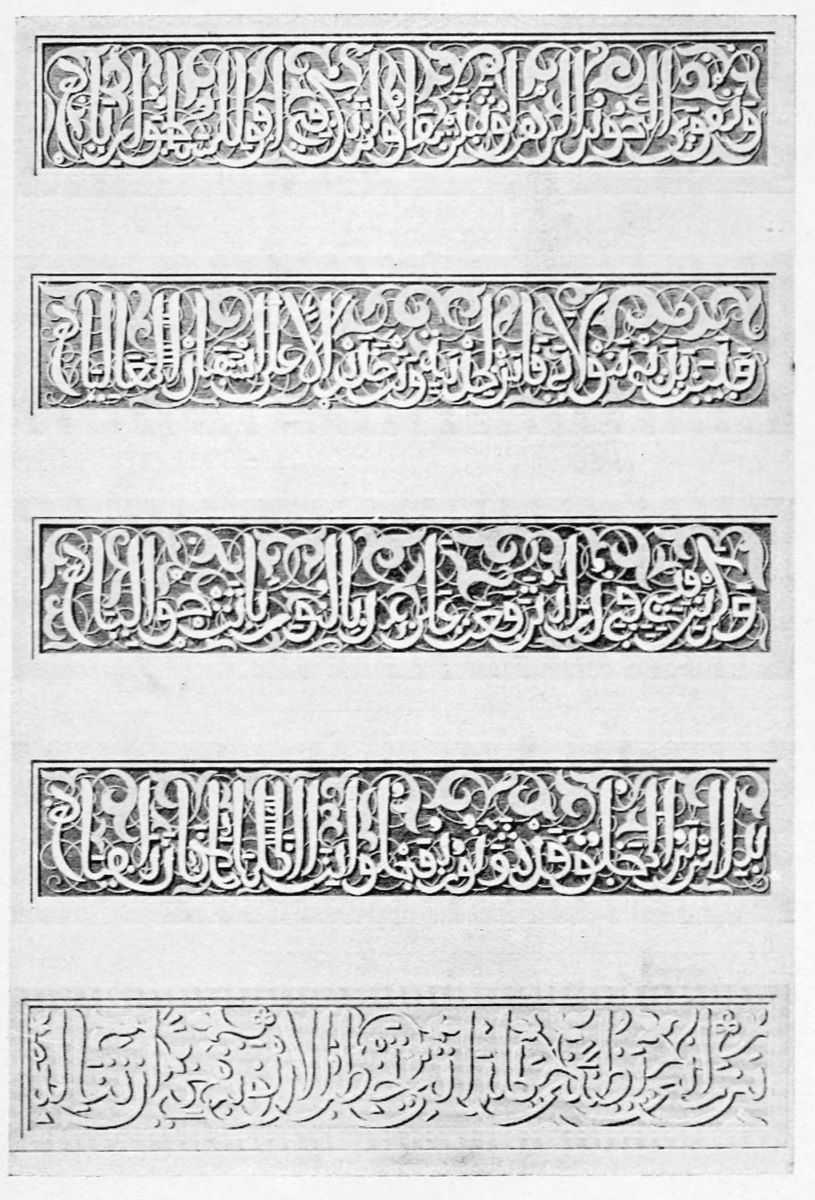 The chapel, which had been established by Ferdinand and Isabel adjacent to the Patio de los Leones, was transferred to this part of the Palace of Philip IV. in 1621. At that time a fine chimney-piece in the Renaissance style was converted into an altar. The apartment contains but few remains of its Moorish builders. Without, is the Patio de la Mezquita, with an exquisite{38} façade, much disfigured by a modern gallery. The walls are adorned with the oft-recurring device, “God alone is Conqueror,” and with sentences extolling the sultans, in various sorts of arabesques. The inscription round the central window refers to Mohammed V. (1354-1391).