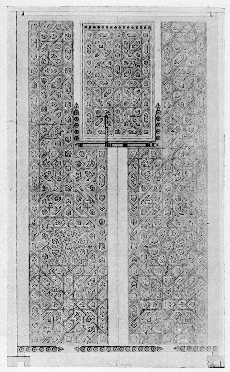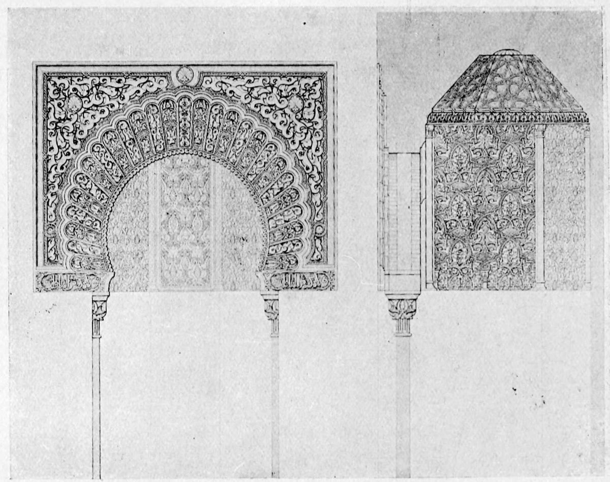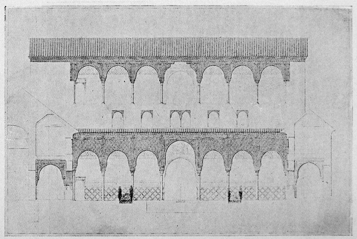 Each arcade is composed of seven semicircular arches, the central one reaching up to the cornice, while the others, much lower, are closed with perforated woodwork or lattices. The roof of the southern gallery is of artesonado or troughed form, and bears seven small cupolas; over the central arch of the northern gallery is a single cupola painted with little gold stars on a blue ground.{41}
