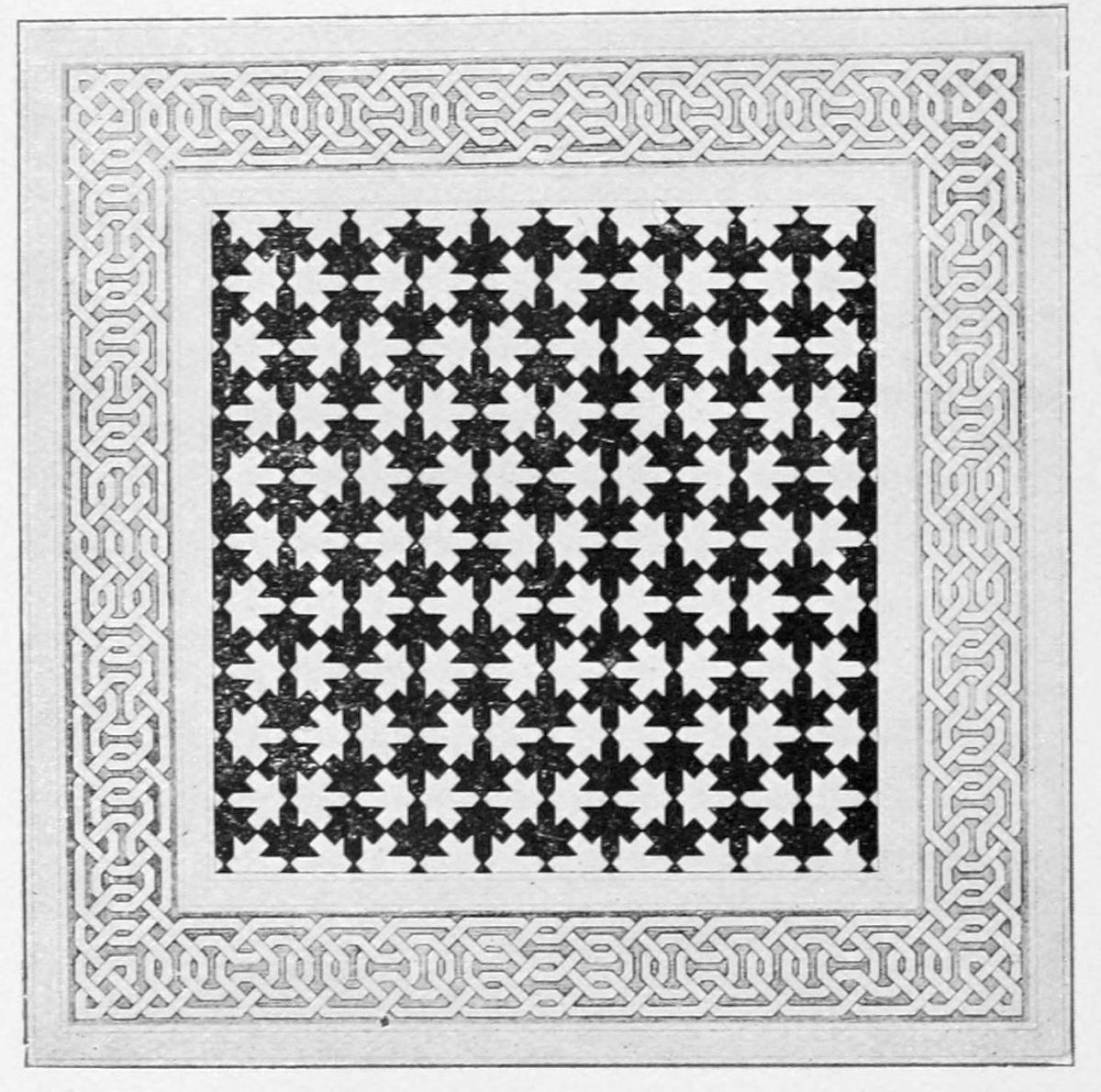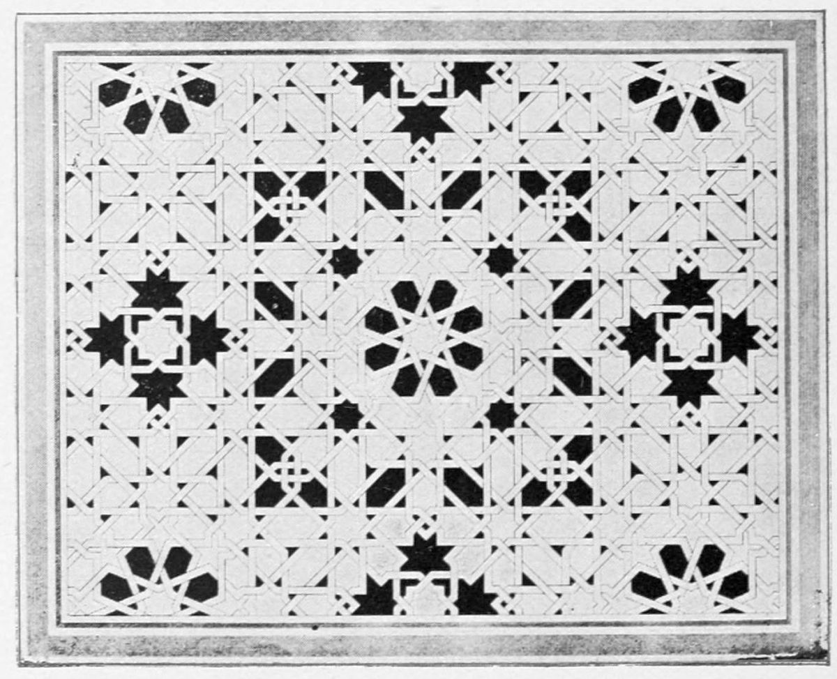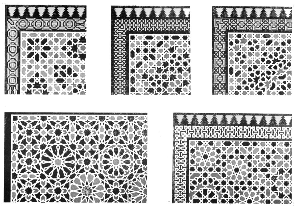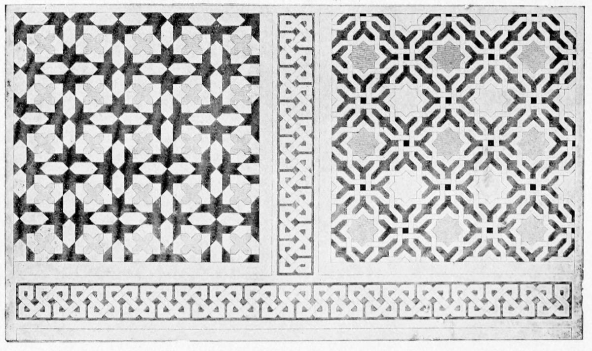It must, however, be admitted that order is much more conspicuous in the decoration than in the ground plan of the palace. All Moorish ornamentation is based on a strictly geometrical scheme, and every design may be resolved into a symmetrical arrangement of lines and curves at regular distances. The intersection of lines at various angles is the secret of the system. All these lines flow from a parent stem, and no figure or ornament is introduced at random. Moslem ornamentation abhors irregularity and rejects symbolism. The law of Islam which forbade the delineation of living objects was not,{35} however, always observed in this palace of half-Europeanised Arabs.