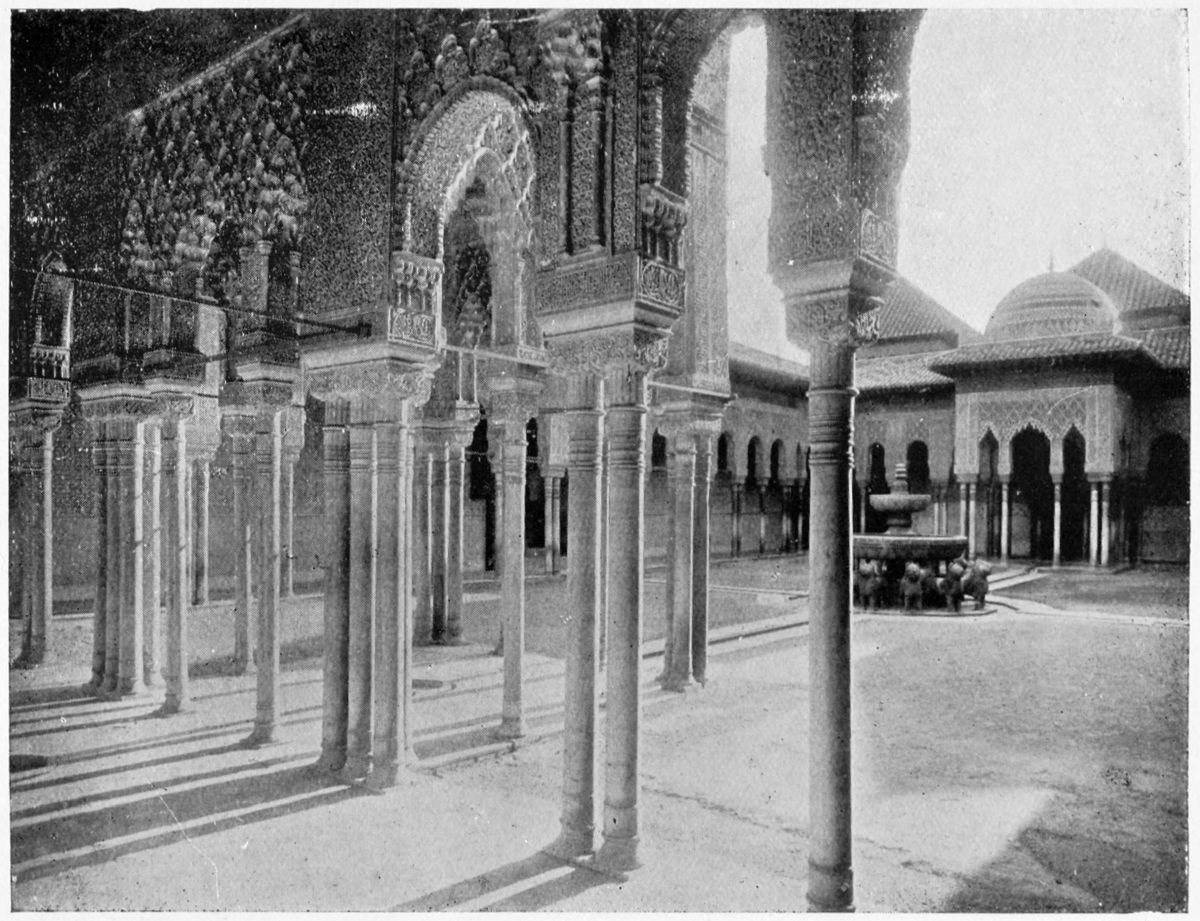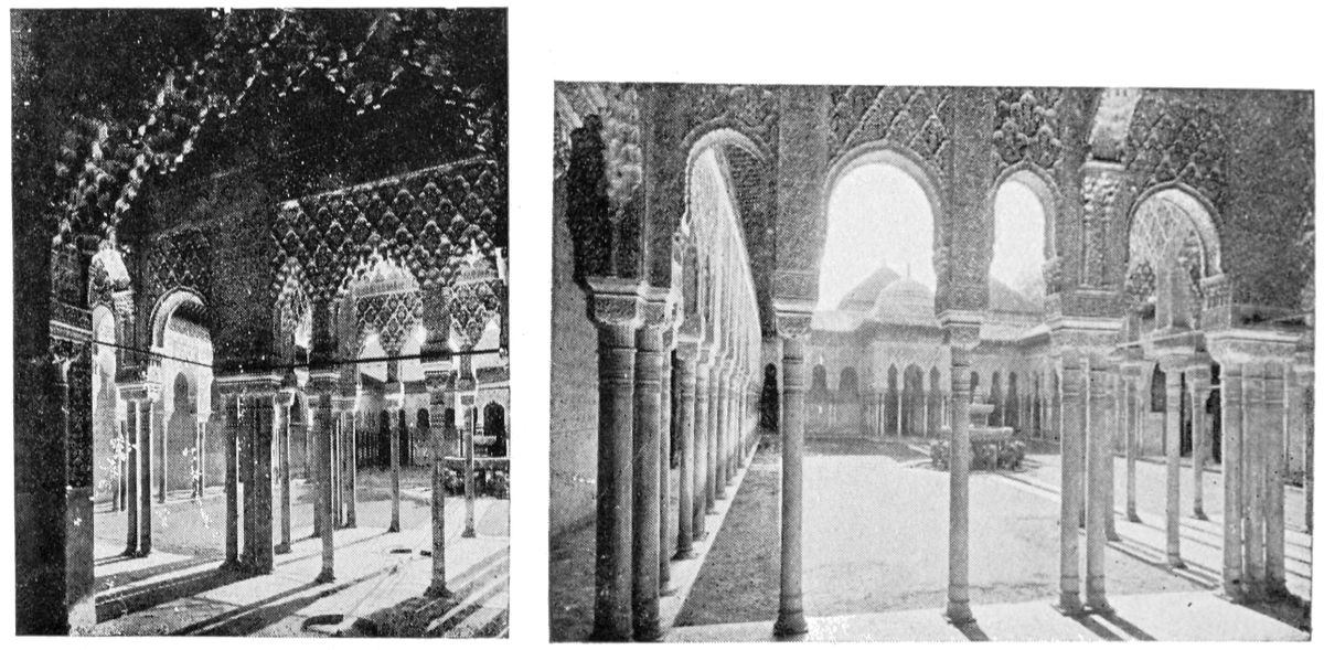 “Let us look for a moment,” writes Mr. John Lomas, “at some points of detail—more especially of the ornamentation. Wherever the eye falls, it may rest upon some fine bit of arcading or peristyle, so delicate in the transparent tracery of its spandrils, in the rich work of its capitals, and its slenderness of pillar, that one marvels at first how such fairy-like construction could stand for even a single generation. ‘Lovers’ tears’ they call this lace-work, and they tell one to stand just within the dim hall or vestibule, and get a vision of the blue sky that appears beyond as a little cloud of sapphires. But it{36} is surely better—an insight into a piece of truer art—to stand outside the eastern kiosk of the Lion’s Court and looking through spandril, vestibule, and sala, catch the light glinting through the distant opposite windows. That is transparency of effect, indeed! One would like to meet with the architect who thought it out.