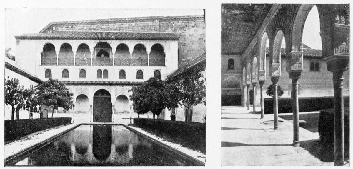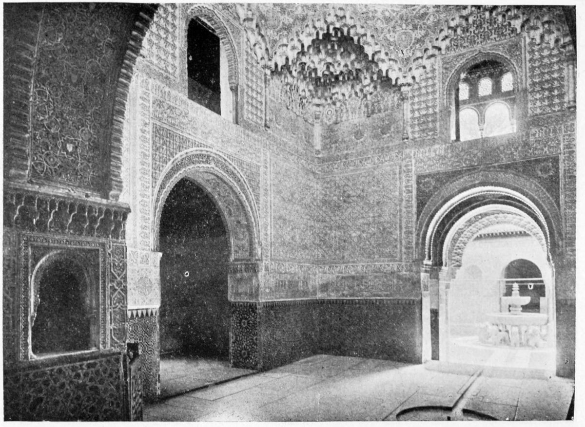 Retracing our steps across the Patio de la Mezquita, we reach the spacious Court of the Myrtles or of the Fish-pond (Patio de los Arrayanes, or de la Alberca). This is the court first entered by the visitor through the modern entrance. It is one of the most beautiful parts of the palace, and gives a foretaste of the glories that lie beyond. One feels immediately transported to the East. “The originality of the architecture [says Don Francisco Pi Margall], the airy galleries, its rich alhamis or alcoves, the splendid apartments of which glimpses are obtained through its arches, the fountains and foliage, the reflection of its stuccoed walls in the waters of the pond, the murmur of the breezes that agitate the dense myrtles, the transparency of the sky, the silence that reigns all about—all oppress the soul at the same time, and leave us for some moments submerged in a sea of sensations which reveal to us little more than the harmony of the whole{40} scene.” The court forms an oblong, bounded at the north and south by two galleries supported on eight columns of white marble, and to the east and west by walls pierced with doors and twin-windows covered with arabesques, but differing in degree of ornamentation. At each angle we find an alhami or alcove, where the Moors were accustomed to laze away the day, extended on rich carpets and divans. The walls of these little places are encrusted with reliefs in stucco, their roofs are of the stalactite pattern. Along the middle of the court extends the alberca or fish-pond, its margins hidden by orange trees and myrtles. The clear water gushes up into two round basins at either end. To the north, the prospect is closed by the battlemented Tower of Comares, to the south by the walls of the Palace of Charles V. Through one of the entrances can be seen the fountain in the Patio de los Leones. The court is redolent of the languor, voluptuousness, and splendour of the East.