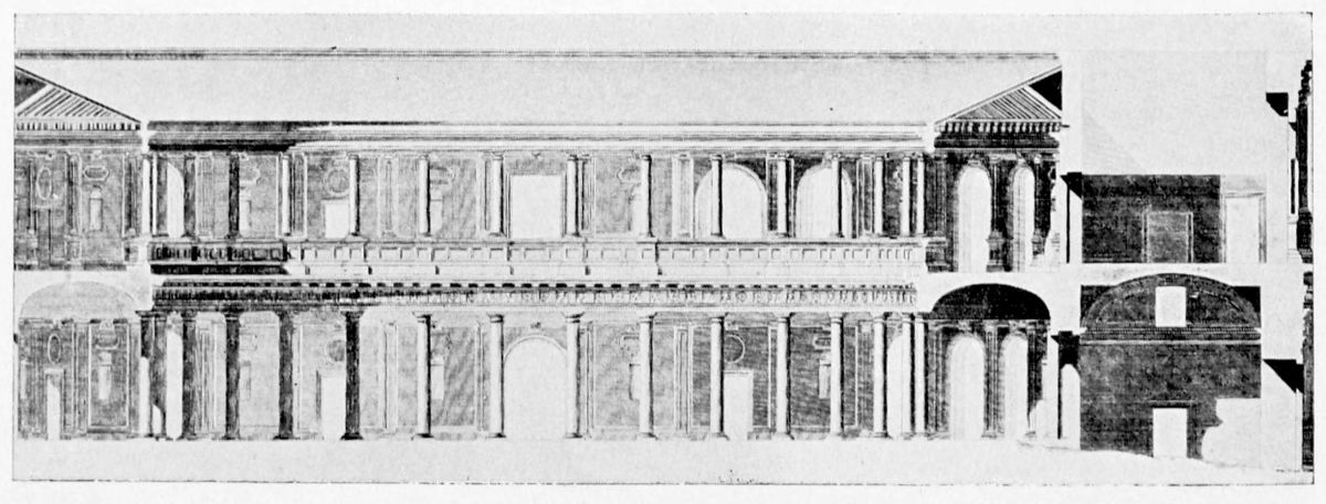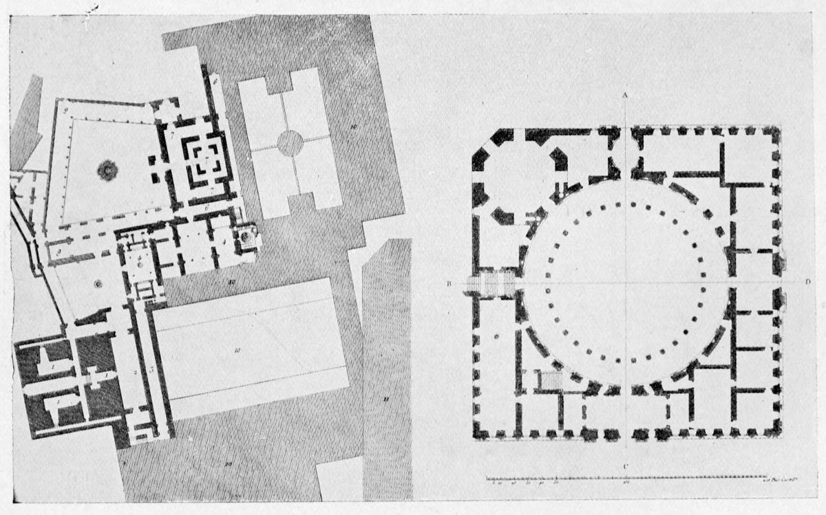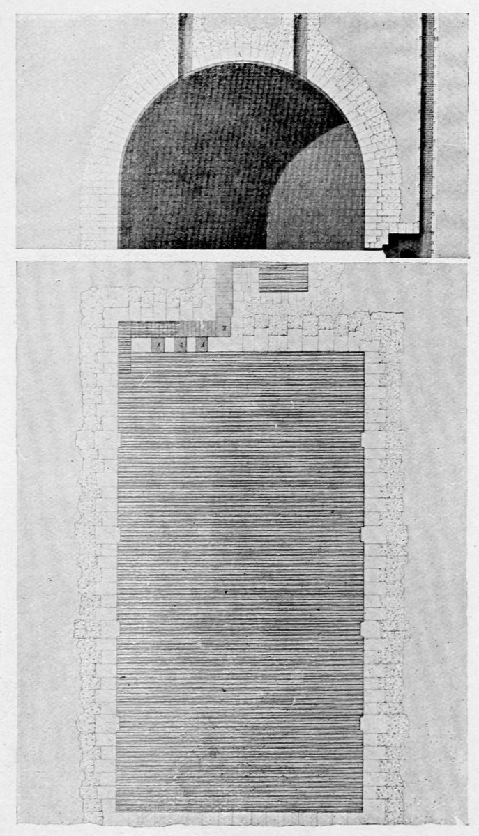 In a foot-note Mr. Lomas adds: “As an instance of the careful way in which the architects of these olden days went to work, it may be mentioned that the exact relation between the irregular widths of cloistering on the long and{37} short sides of the court is that of the squares upon the sides of a right-angled triangle. This obtaining of beautiful symmetry through irregularity is a strangely lost art.”