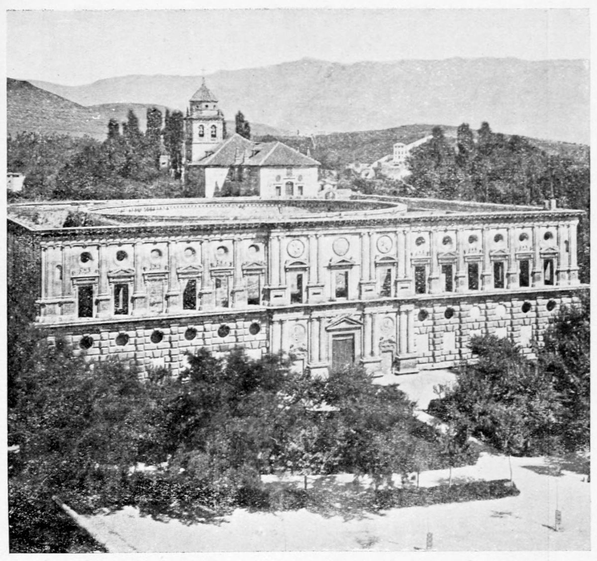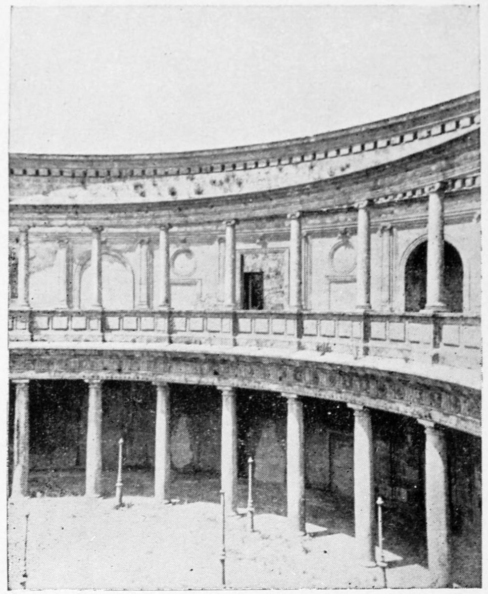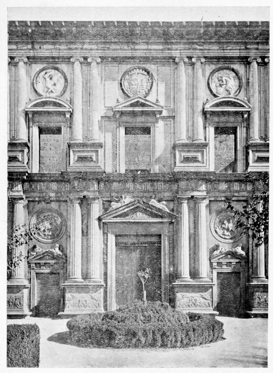 Having crossed the Plaza de los Algibes, we leave behind us the early Moorish works, and approach the buildings which owe their foundation to the Nasrite or Grenadine dynasty. The story which credits Al Ahmar (Mohammed I.) with the creation of the Red Palace in the middle of the thirteenth century appears to{31} be well-founded, for when the Alhambra is referred to as existing in earlier times, it is undoubtedly the Alcazaba that is meant. To the same hands may be safely attributed the great outer wall of the Alhambra which girdles palace and fortress, following the inequalities of the hill’s contour. Al Ahmar has left his device, Wa ha ghalib ila Allah (There is no conqueror but God), in many parts of the building. These words were uttered by him in mournful deprecation of the acclamations of his subjects on his return from assisting the Christians in the Conquest of Seville. During the two and a half centuries of the Nasrite rule, the palace underwent many radical transformations and renovations, so that it is difficult to distinguish between the works of the various sultans. Ford infers, rightly as it seems to us, from the frequent repetition of their names upon the walls, that Yusuf I. and Mohammed V. had the largest share in the embellishment and restoration of the edifice. Since the Reconquest many changes and additions have been made—notably the Palace of Charles V., to which detailed reference will be made later.