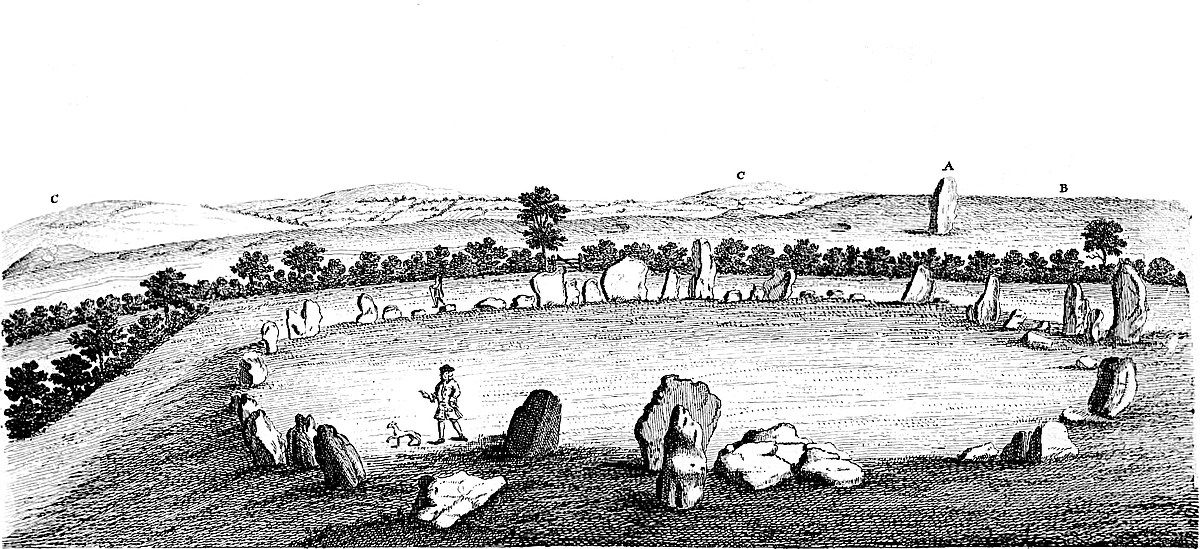 The circle itself is compos’d of stones of various shapes and dimensions, set pretty near together, as may best be seen by the drawings, Table III, IV. They are flattish, about 16 inches thick. Originally there seems to have been 60 in number, at present there are 22 standing, few exceeding 4 foot in height; but one in the very north point much higher than the rest, 7 foot high, 5½ broad. There was an entrance to it from the north-east, as is the case at Stonehenge. Ralph Sheldon, esquire, dug in the middle of the circle at Rowldrich, but found nothing.