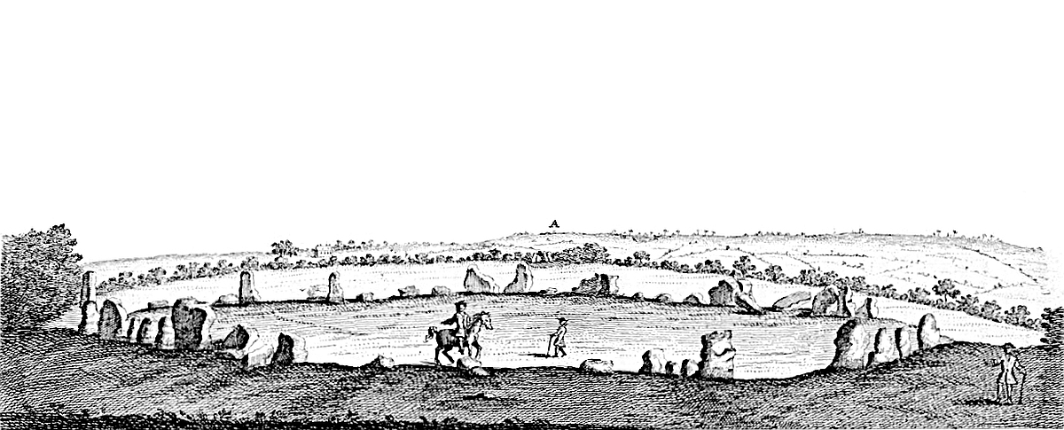 2. ’Tis an open temple of a circular form, made of stones set upright in the ground. The stones are rough and unhewn, and were (as I apprehend) taken from the surface of the ground. I saw stones lying in the field north of Norton, not far off, of good bulk, and the same kind as those of our antiquity. There are such in other places hereabouts, whence the Druids took them: tho’ in the main, carry’d off ever since, for building and other uses.