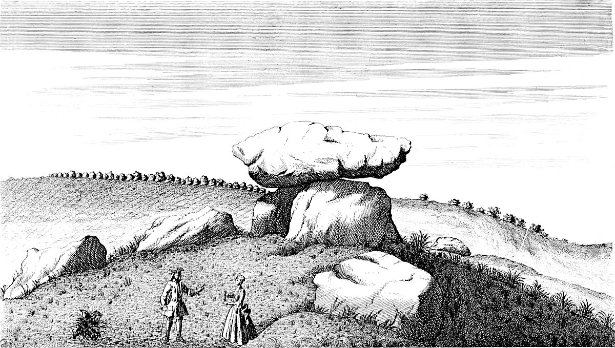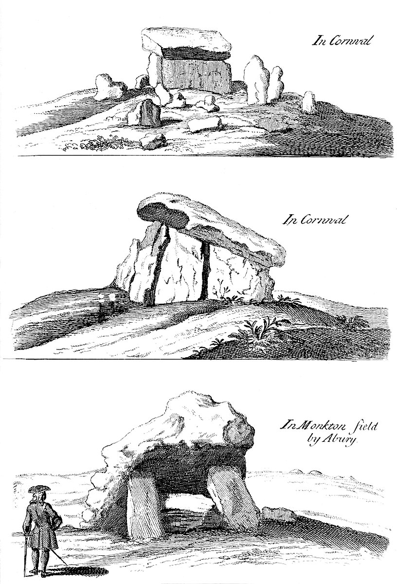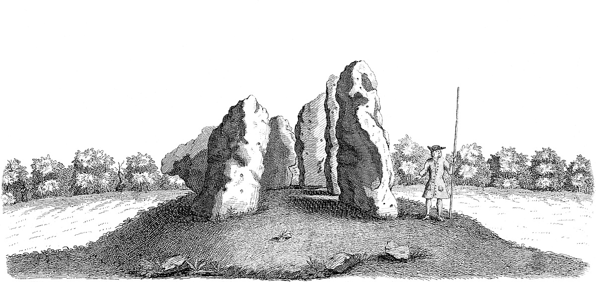 Return we nearer to the temple, and we see 300 paces directly east from it in the same field, a remarkable monument much taken notice of; ’tis what the old Britons call a Kist vaen or stone chest; I mean the Welsh, the descendants of those invaders from the continent, Belgæ, Gauls and Cimbrians, who drove away the aboriginal inhabitants, that made the works we are treating of, still northward. Hence they gave them these names from appearances; as Rowldrich, the wheel or circle of the Druids; as Stonehenge they call’d choir gaur, the giants’ dance; as our saxon ancestors call’d it Stonehenge, the hanging-stones, or stone-gallows. Every succession of inhabitants being still further remov’d from a true notion and knowledge of the things.