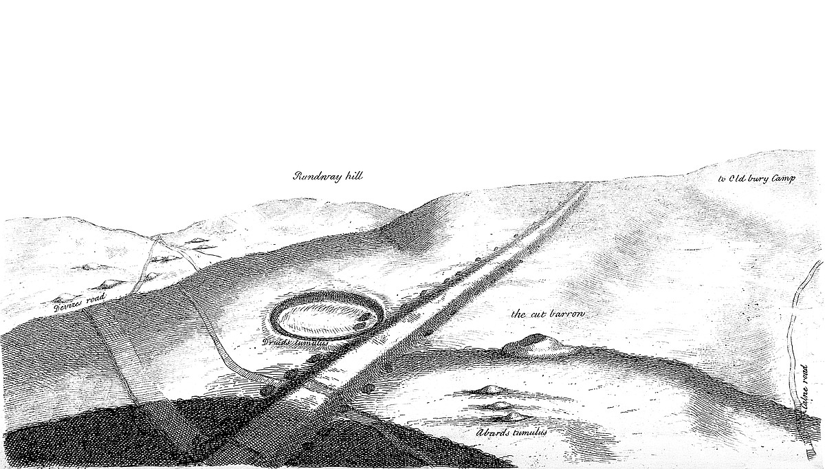 In the same plate may be seen another barrow, but circular, below the road to the left hand, on the side of the hill. Under it is a spring-head running eastward to Long Compton. This barrow has had stone-work at the east end of it. Upon this same heath eastward, in the way to Banbury, are many barrows of different shapes, within sight of Rowldrich; particularly, near a place call’d Chapel on the heath, is a large, flat, and circular tumulus, ditch’d about, with a small tump in the center: this is what I call a Druid’s barrow; many such near Stonehenge, some whereof I opened; a small circular barrow a little way off it. There are on this heath too, many circular dish-like cavities, as near Stonehenge, we may call them barrows inverted.