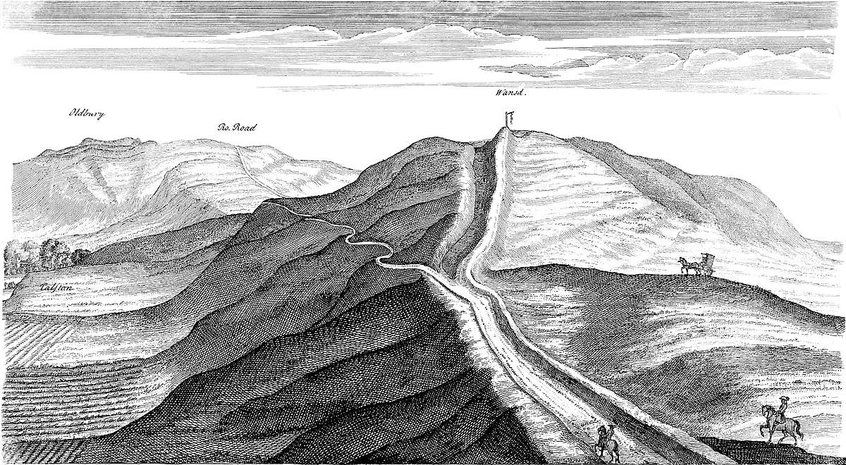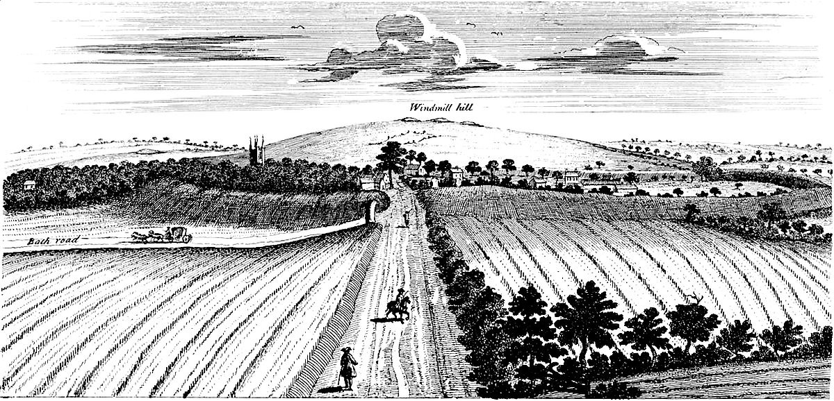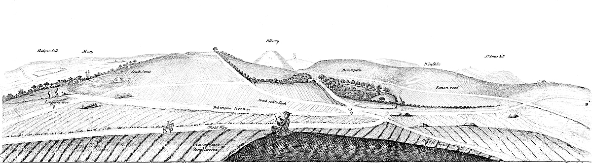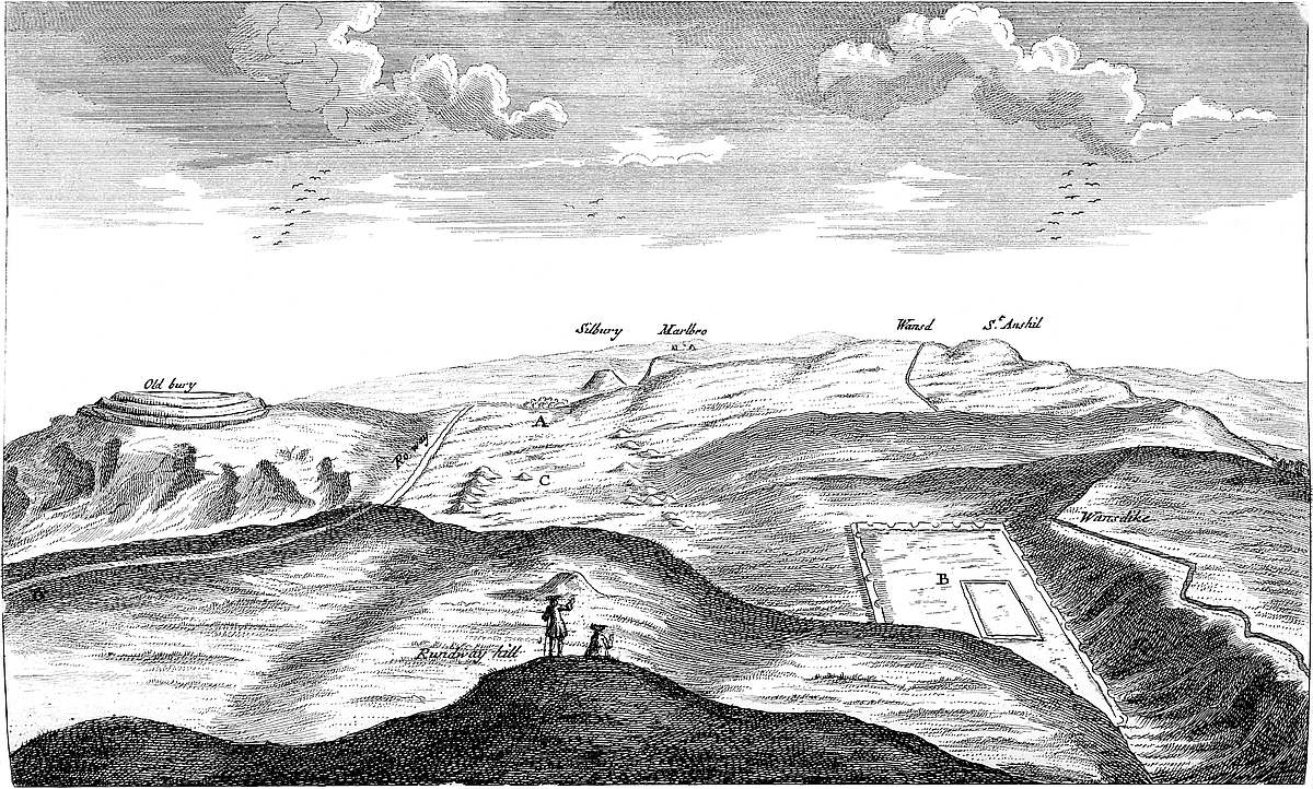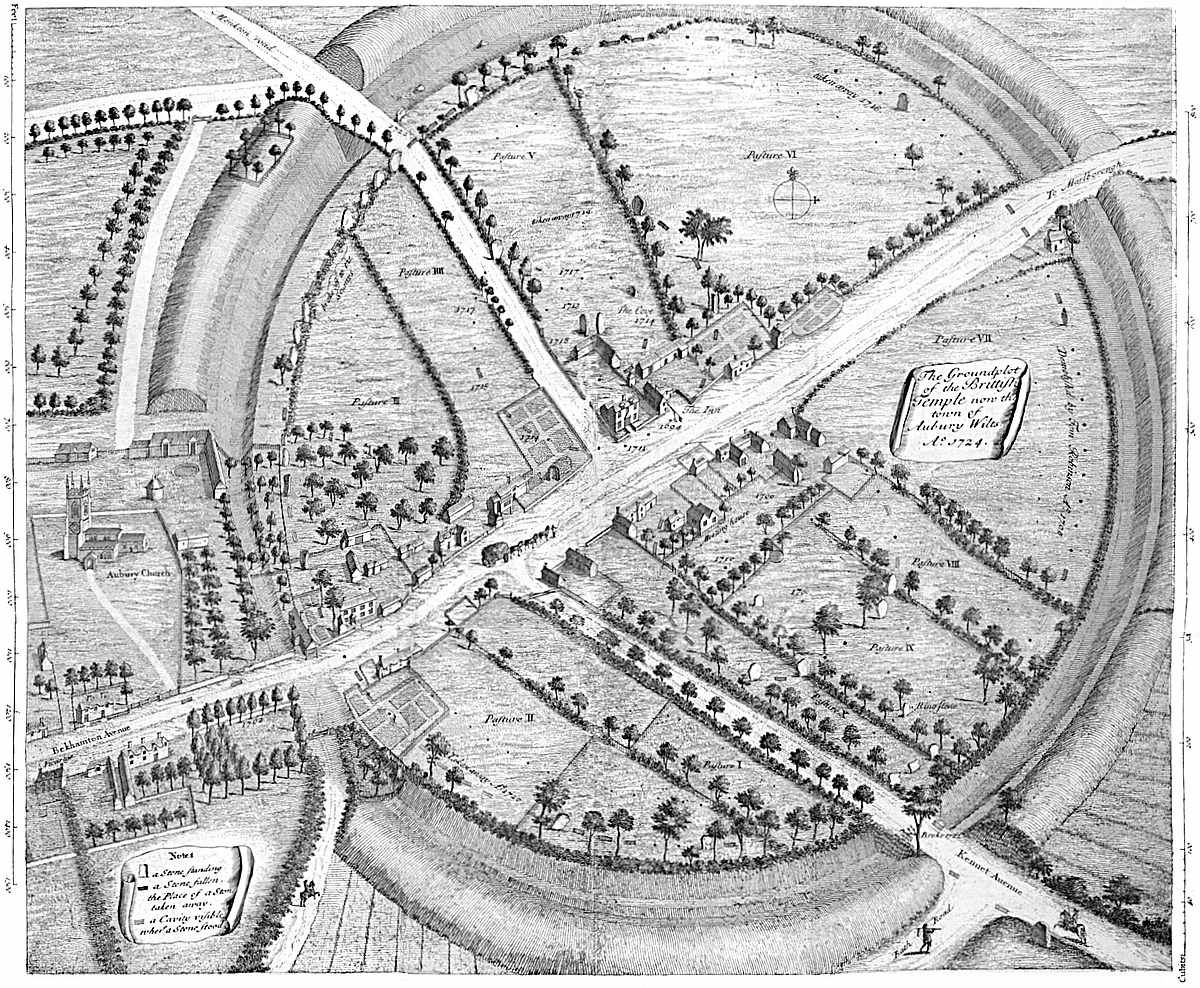 THE situation of Abury is finely chose for the purpose it was destin’d to, being the more elevated part of a plain, from whence there is an almost imperceptible descent every way. But as the religious work in Abury, tho’ great in itself, is but a part of the whole, (the avenues stretching above a mile from it each way,) the situation of the intire design is likewise projected with great judgment, in a kind of large, separate plain, four or five miles in diameter. Into this you descend on all sides from higher ground. The country north of Abury, about Berwick-basset and Broad Hinton, is very high, tho’ not appearing so to be, and much above the level of Abury town. In a field of Broad Hinton the water runs two ways, into the Thames and Severn, and they pretend ’tis the highest ground in England. ’Tis indeed part of that very great ridge of hills, coming from Somersetshire, and going hence north-eastward, to the white-horse hill. So that the ground northward and westward, tho’ not much appearing so, is still very high, a cliff descending that way; and whilst guarded to the east by the Hakpen, yet it may be called like the thessalian, of the same name,