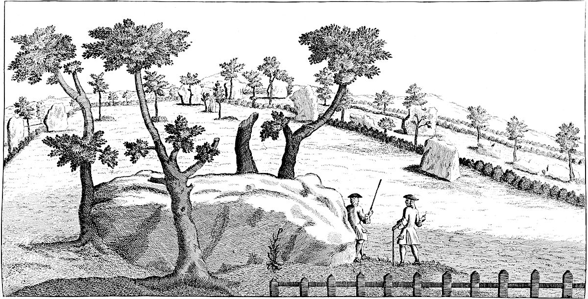 Just before I visited this place, to endeavour at preserving the memory of it, the inhabitants were fallen into the custom of demolishing the stones, chiefly out of covetousness of the little area of ground, each stood on. First they dug great pits in the earth, and buried them. The expence of digging the grave, was more than 30 years purchase of the spot they possess’d, when standing. After this, they found out the knack of burning them; which has made most miserable havock of this famous temple. One Tom Robinson the Herostratus of Abury, is particularly eminent for this kind of execution, and he very much glories in it. The method is, to dig a pit by the side of the stone, till it falls down, then to burn many loads of straw under it. They draw lines of water along it when heated, and then with smart strokes of a great sledge hammer, its prodigious bulk is divided into many lesser parts. But this Atto de fe commonly costs thirty shillings in fire and labour, sometimes twice as much. They own too ’tis excessive hard work; for these stones are often 18 foot long, 13 broad,16 and 6 thick; that their weight crushes the stones in pieces, which they lay under them to make them lie hollow for burning; and for this purpose they raise them with timbers of 20 foot long, and more, by the help of twenty men; but often the timbers were rent in pieces.