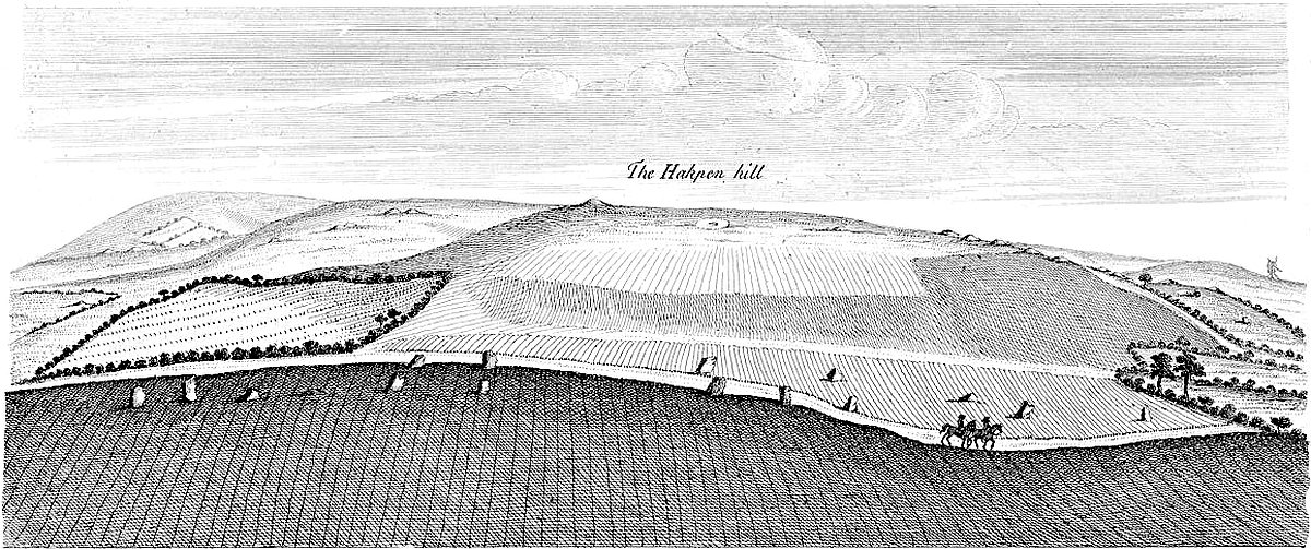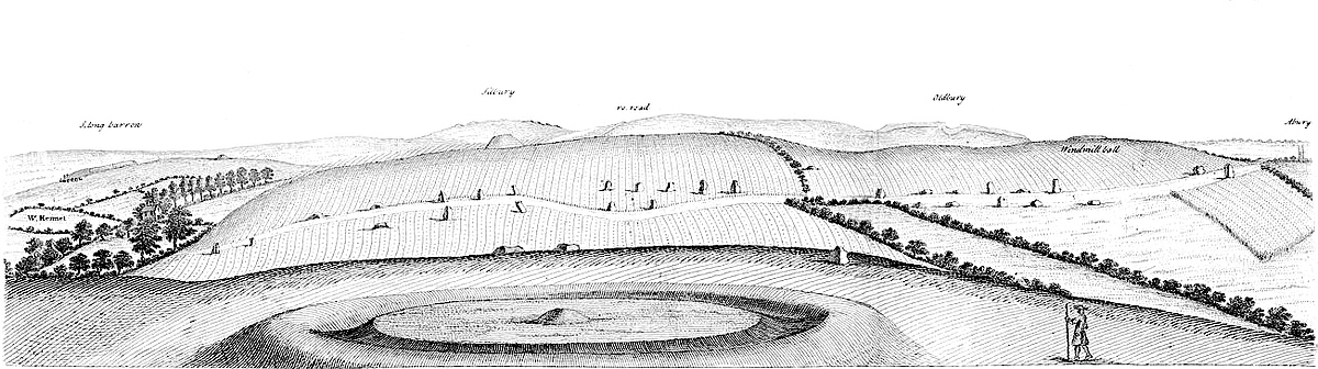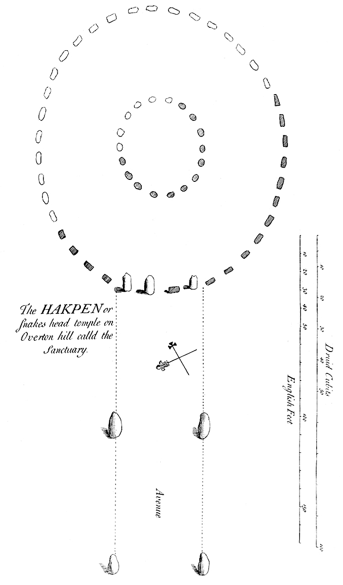 In order to put this design in execution, the founders well studied their ground; and, to make their representation more natural, they artfully carry’d it over a variety of elevations and depressures, which, with the curvature of the avenues, produces sufficiently the desired effect. To make it still more elegant and picture-like, the head of the snake is carried up the 19southern promontory of the Hakpen hill, towards the village of West Kennet; nay, the very name of the hill is deriv’d from this circumstance, meaning the head of the snake; of which we may well say with Lucan, lib. IV.