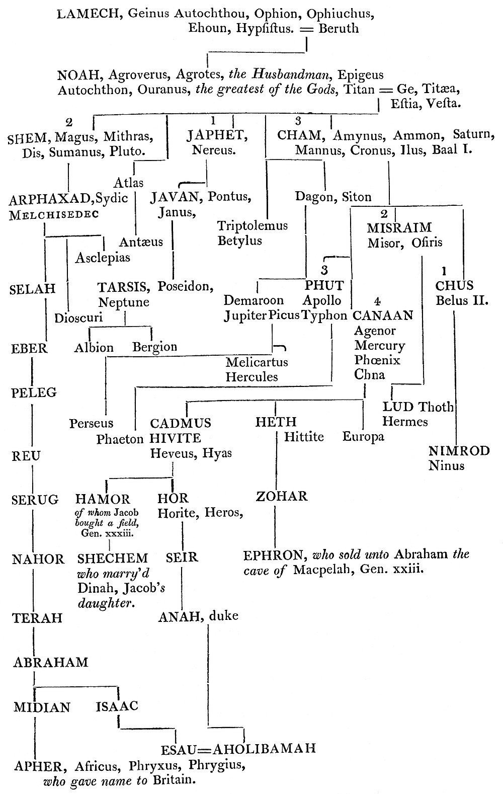 I suppose Canaan when he died, had an alate temple built about his place of sepulture, which in after times occasion’d posterity to deify him under the name of Mercury. Again I suppose the like done over the tumulus of the patriarch TARSIS; which gave a handle in idolatrous times, to consecrate him into the Neptune of the heathen; who in effect is the same as Mercury, saving that being done by people of a different genius and disposition, they divided one god into two.
