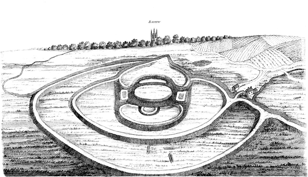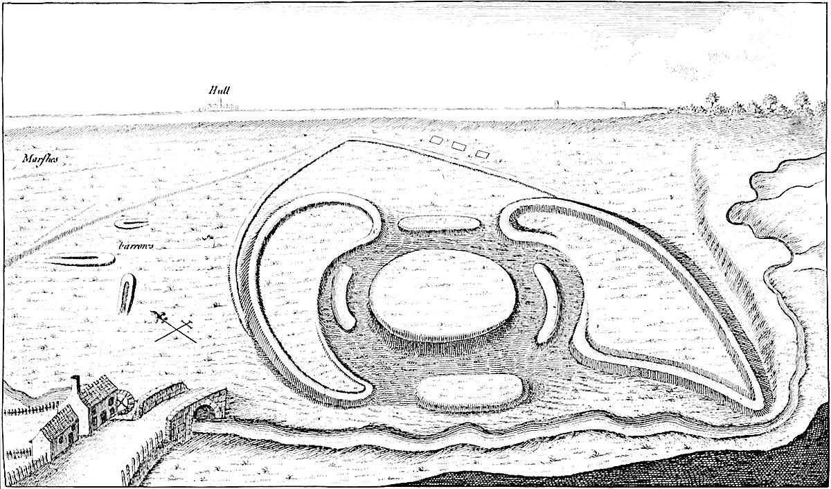A rivulet rises near the town of Barrow, and when it falls off the high ground, and enters on the level marshes on the Humber shore, it turns a mill. Just there, upon the edge of the marsh, upon a gentle eminence, nearly overflow’d by high spring-tides, and between the salt and fresh water, is the work we are to speak of, made of great banks of earth thrown up, in an odd manner, which gives it the denomination of castle. I observ’d all about it, and in the adjacent marshes, many long tumuli of different sizes, but all of a particular shape, such as I had never seen elsewhere, being form’d like a bed. I immediately set to work in digging into several of them, and we found burnt bones, ashes, bits of urns, and such kind of matters, all extremely rotten and decay’d; and the very same appearances as I had so often seen, in digging the barrows about Stonehenge and Abury.