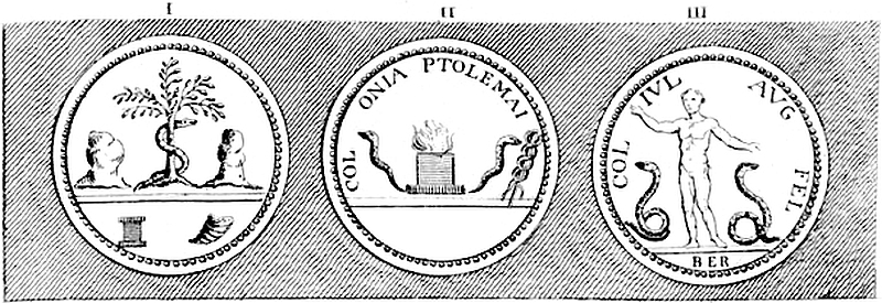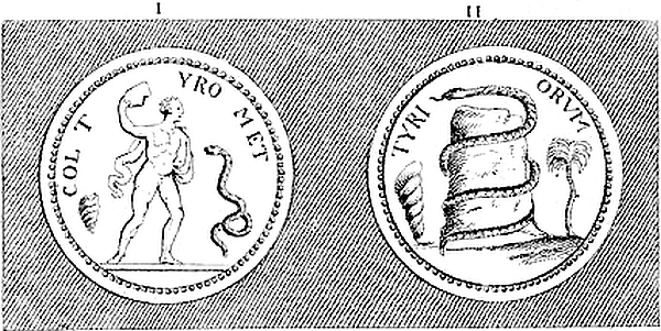 We mention’d before that Phut married Rhode, whence the isle of Rhodes had its name. Rod in the Psalms and the Prophets signifies a snake. Nay Pliny in vii. and 56, of his natural history asserts, that Rhodes was originally call’d Ophiusa, a word equivalent. Most likely they built a serpentine temple there, which gave the name. So the isle of Tenos, which Bochart shews, means a serpent in the oriental language, was call’d Hydrusa and Ophiusa. The isle of Cyprus was call’d Ophiodia by Nicœnetus. So Hydra an isle just before Carthage, which was first built by Cadmus. Ophiades insulæ on the Arabian coast of the Red-sea. Pausanias mentions a place called Opheos Cephale, the serpent’s head; the same as our Hakpen on Overton-hill in Abury.