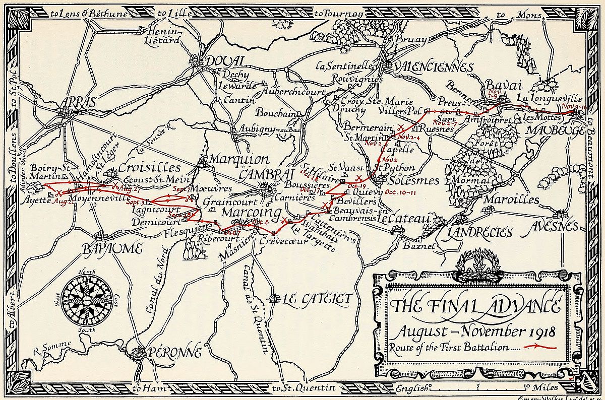 But work was still to do. Between Cambrai, which at the end of October was under, though not actually in,[310] our hands, and Maubeuge, lay thirty-five miles of France, all open save for such hastily made defences as the enemy had been able to throw up after the collapse of the Hindenburg systems. There, then, the screw was turned, and on the 8th October the Third and Fourth Armies attacked on a front of seventeen miles from Sequehart, north of Cambrai, where the Cambrai-Douai road crosses the Sensée, southward to our junction with the French First Army a few miles above St. Quentin. Twenty British divisions, two cavalry divisions, and one American division were involved. The Battalion faced the changed military situation, by announcing that companies were “at the disposal of their commanders for open warfare training.” After which they were instantly sent forward from their Demicourt trenches, to help make roads between Havricourt and Flesquières!