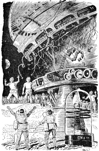 Early the next morning a subordinate technician of the Machine hammered on the airlock. The two terrestrials pulled on their heavy jackets, fur boots, and gauntlets, started the little air-pumps on their shoulders, and opened the lock. "The honored First Technician of the Machine invites your presence at your trial, which is to begin very soon," the Martian said, speaking halting Esperanto. Kim and Barnaby followed him to the edge of the Machine bowl. There had been several changes made during the night. An elevated platform had been set up, identical to the one used in the bloody execution they'd witnessed. About twenty Martians were clustered around the Machine, some of them making last-minute adjustments in the mechanism; others, evidently sightseers, gazing curiously at the two principals in the trial.