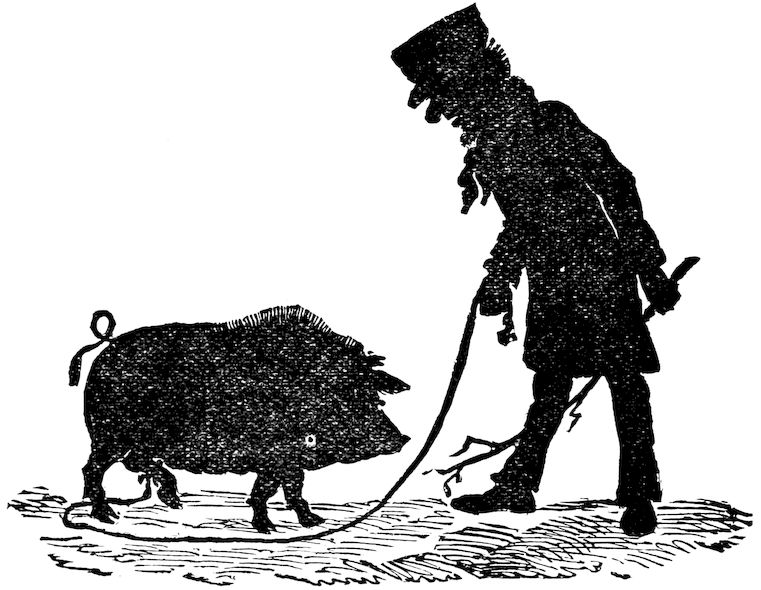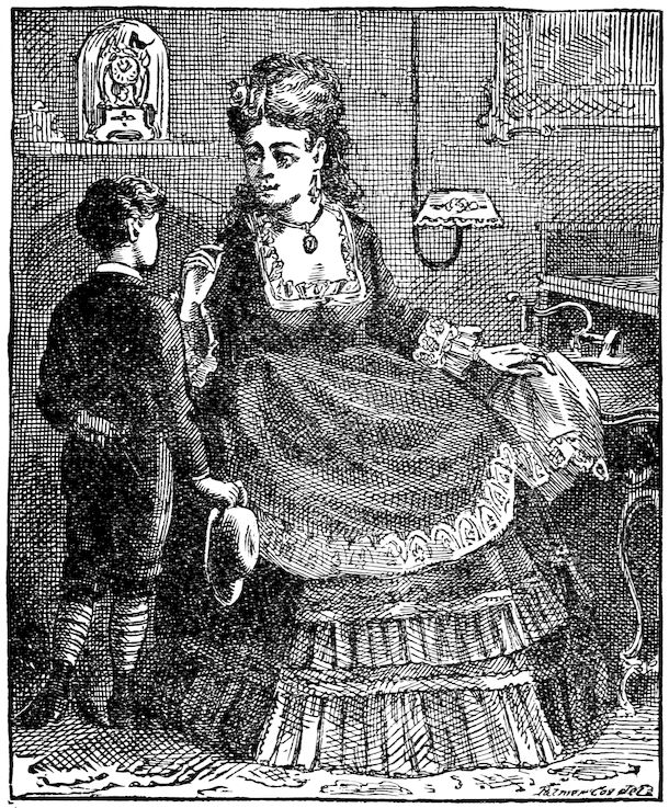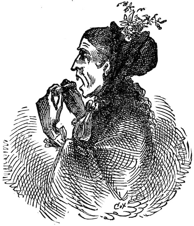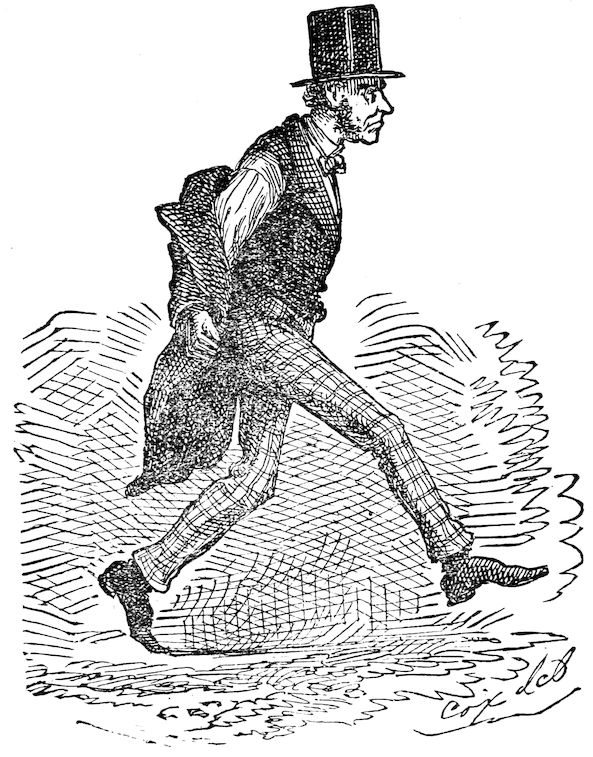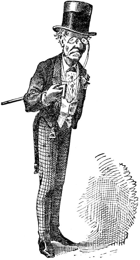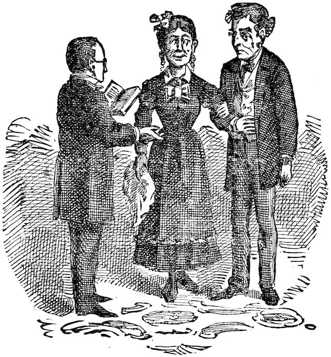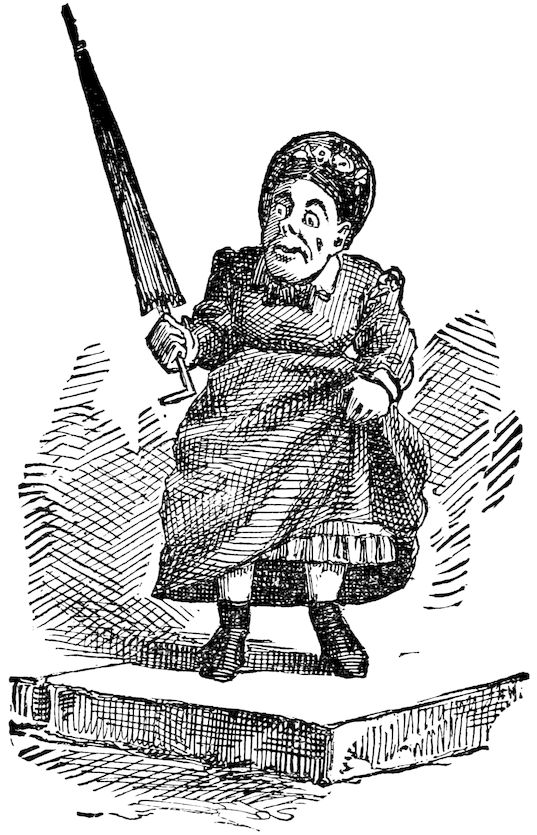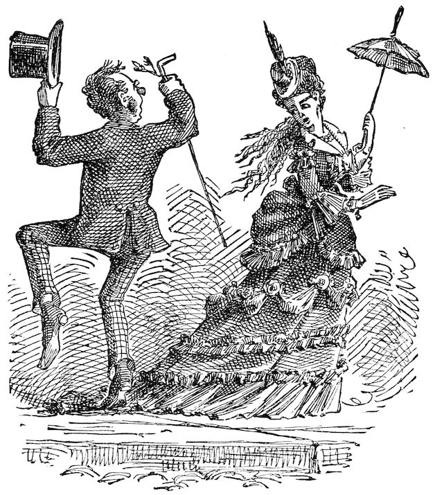 Besides, I saw his wife last evening with fully 516four yards of expensive satin trailing in the dust. It was my misfortune to be walking directly behind her. As the crowd was pressing me onward, I was obliged to dance a sailor’s hornpipe around the hall, in order to keep from treading upon her skirts. It needed not the grins of lookers-on to assure me that I was cutting a ridiculous figure.