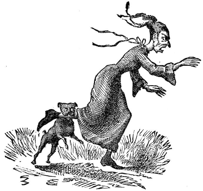 “‘It must hev dropped out last night, then,’ ses I, and with that I overhauled him agin. Past Brian O’Laughlan’s door yard we went 472like a whirlwind through a flour ‘mill, over a hen and three suckin’ pigs. The old woman was standin’ thar in the yard with her apron full of chickens, shakin’ her fist at us and swearin’ like a drunken gypsy. Her long tongue was a-slushin’ and dashin’ against her one front tooth like a mop ag’inst a table leg.