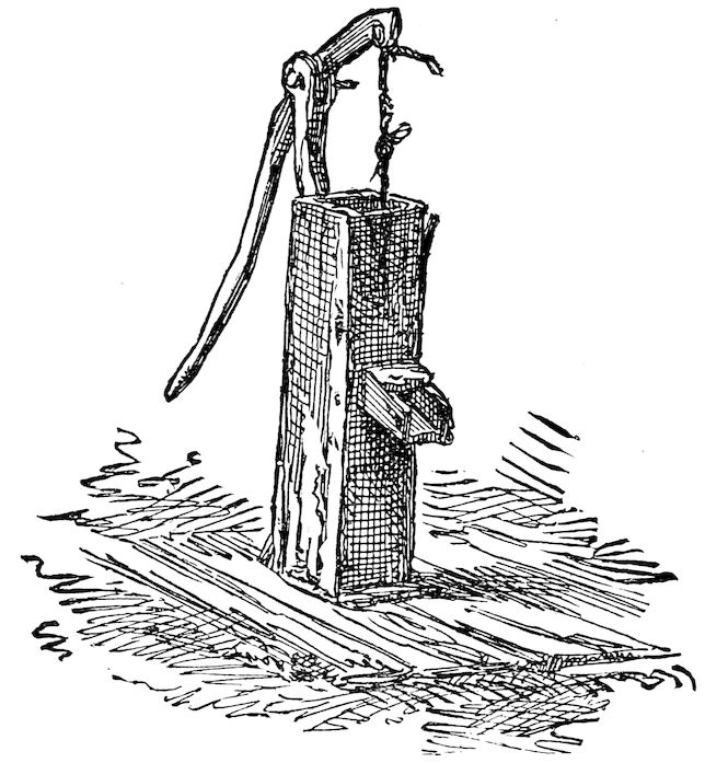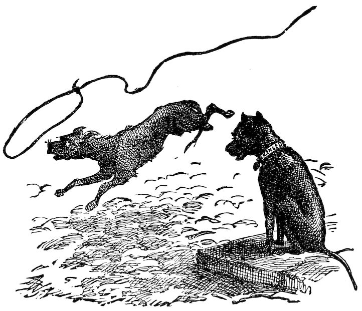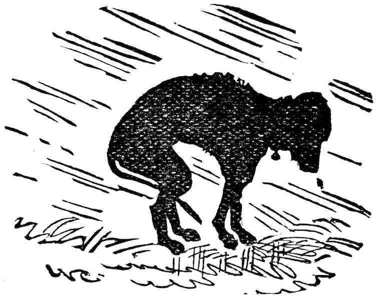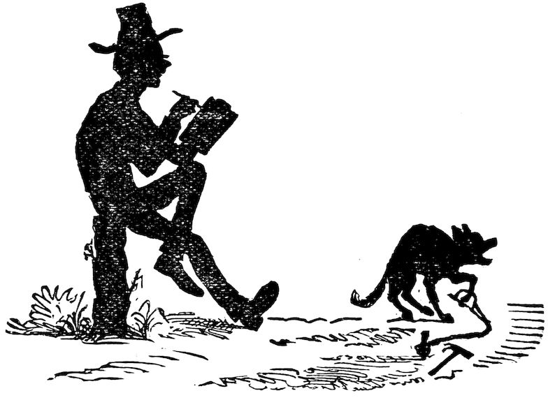 510He had the foot of a little cur fast in the jaws of a steel-trap staked in the orchard. The artist sat at a short distance sketching the poor beast, as it stood on three legs gazing at the heavens and crying piteously. He was eagerly striving to get the expression of pain upon the dog’s face, and by the grin upon his own countenance I judged he was succeeding.