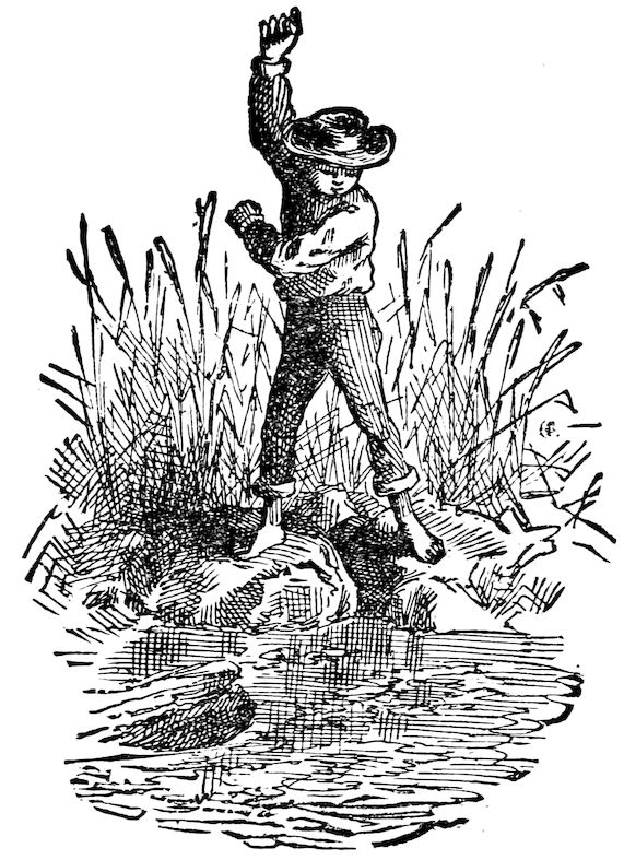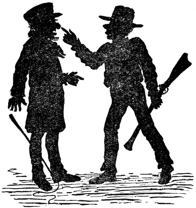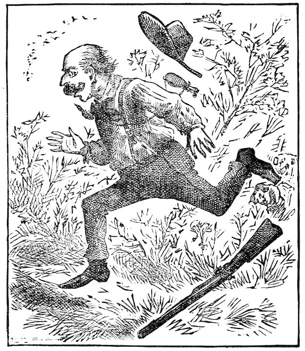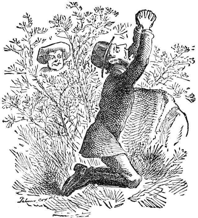 475“He gin a rousin’ whoop like a Chilchat Indian, when he sights a fur hunter. Throwin’ away the pitchfork—which accidentl’y harpooned the old lady in the back who was rakin’ behind—and jumpin’ from the load, he took across the field to’ards the turnpike, swingin’ his old straw hat and hollerin’:—
