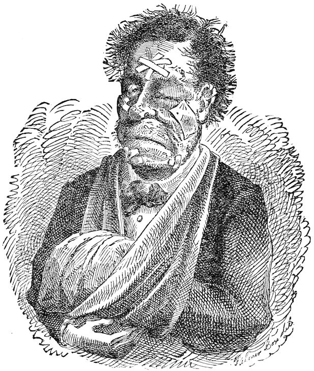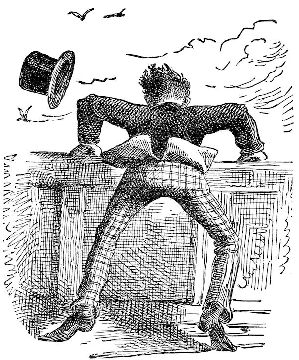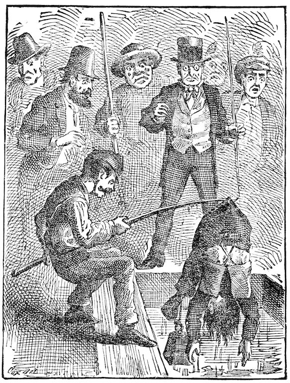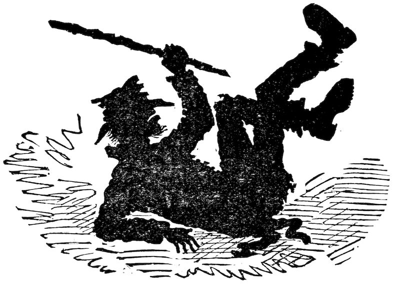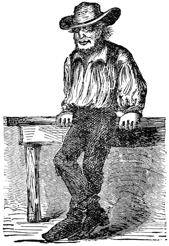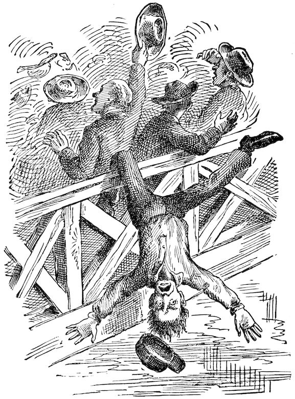 “Ole Pelvy, the shoemaker, was a-settin’ on the railin’ of the bridge; but jest as I crossed it, the crowd hoorayed, and jostled him off. He hung over the railin’ by one leg, with his body swayin’ below, and him a-hollerin’ like a good feller, and signalin’ for help, but the crowd were so taken up with the race, and were cheerin’ and swingin’ of their hats continewally, that they never knowed anythin’ about his position.