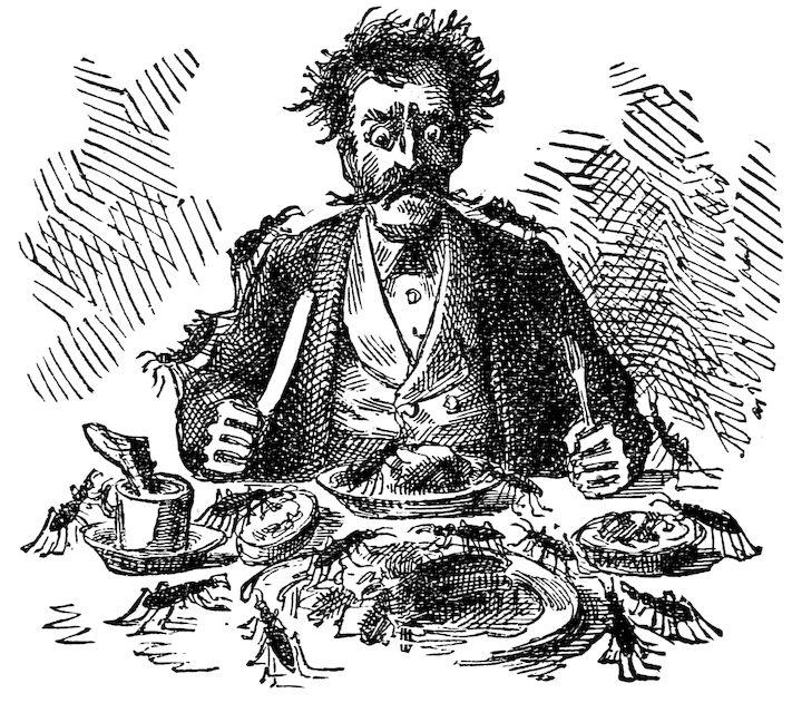 Taking dinner to-day in a restaurant, I was in danger of being carried off by cockroaches. If I was inclined to draw comparisons, I would say that in size the cockroaches I encountered in this place would compare favorably with cupboard door buttons. I had seen these troublesome insects on former occasions when I thought they were numerous—when they were as thick around the bread-plate as bees around their hive in June. But I had never been present when they turned out in sufficient numbers to take and hold possession of everything upon the table, even to the mustard-pot. To-day I witnessed such a spectacle. I counted until I tired; their skelping to and fro made the task painfully difficult, and the effort was abandoned. They had evidently been lying in ambush in the cruet stand from the moment I sat down and gave my order, for the ring of the plate as it 484struck the board seemed to be the signal for a general advance. They appeared in military ranks, moving towards the dish in a semicircle, like a line of Fenian skirmishers advancing heroically upon a turnip patch. There were no frost-nipped fellows, with drooping horns and dragging limbs, among those legions either. All were active, square-shouldered customers, real thoroughbreds, wide across the hips, and boasting a depth of chest capable of enduring any amount of running; while their long, formidable-looking feelers stood out at right angles from their heads, like the horns on a Mexican steer.