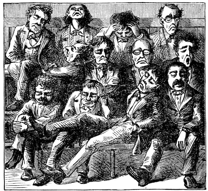 The judge began to show unmistakable signs of impatience. He remarked that already a package of letters had been read that would go far towards shingling the Mechanics’ Pavilion, and had no more bearing upon the point at issue than “Darwin’s Descent of Man” had upon the culture of white beans. He finally gave way before the preponderance of the prosecuting attorney’s argument, and directed an officer to wake the jury, as a letter was to be read that all should hear. After considerable shaking and poking, this difficult duty was performed. Even the deaf juror was aroused, though the good-natured judge had permitted him to sleep during the introduction of several preceding epistles.