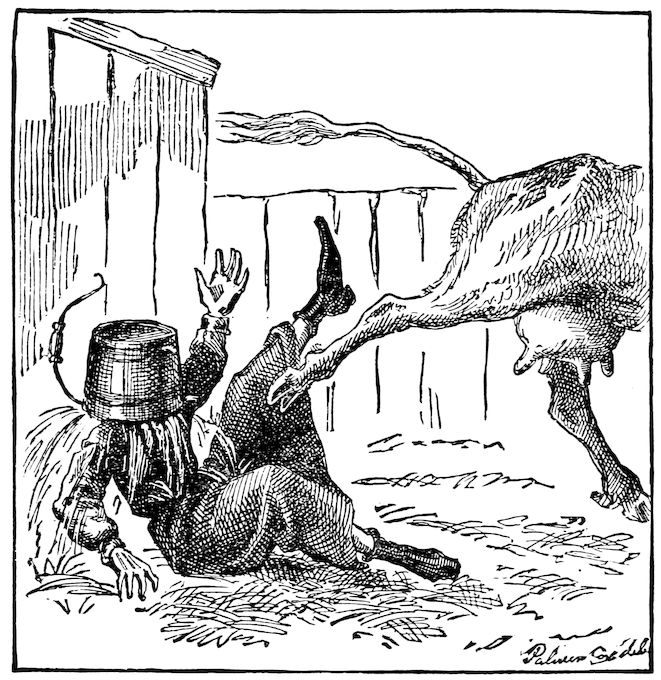 I reached my destination, and was convinced that all the sorrows are not on the sea. I saw a poor old woman thrown into terrible disorder by a kick from the cow she was milking in her own yard. Judging by the quantity of milk lying around loose, she must have been nearly through her task, and was probably in the very act of complimenting the cow for her generosity, when the spiteful animal gave the pail a hoist completely over the woman’s head, like a huge 508helmet, while the lacteal fluid ran down her body. The pail seemed to stick, despite her efforts to remove it.