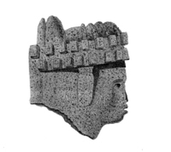 Male, standing figure. Head, chest with arms, and upper part of legs broken off, and lying in four pieces on the ground. The pedestal was square, with the upper part ornamented with angular wreaths; it remained fixed in the ground in its original place, and carried still the feet and the legs (to the knees) of the figure. The face was of quite a different type from those of A and B, with very prominent cheek-bones, large lips, and strongly protruding under-jaw; it was adorned with a crown-shaped head-gear. The ears were also here hidden by flat pieces, thickening upwards, with the lower corners rounded. The back of this statue, as well as its position in the periphery of the stone-mound, points to its having formed part of the wall of the building; but it seems not, however, to have served the purpose of supporting the roof, because the upper part of the crown was finely chiselled, and exhibited no trace of a tenon. It differed in this point from all the other statues in the circumference of the mound 1, with the exception of E 1, that was situated almost opposite to D at the western longside. The height of the head from the upper rim of the crown to the lower edge of the chin was 45 cm. The length of the trunk from the shoulders to the thighs was 60 cm. The breadth across the shoulders was 54 cm.