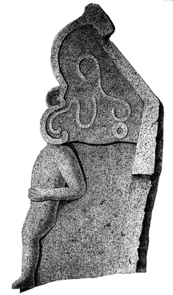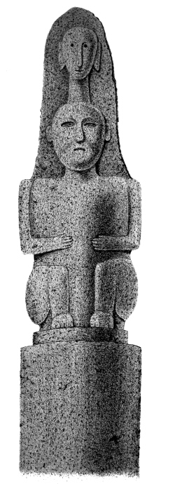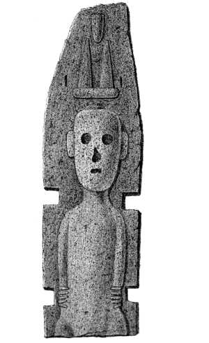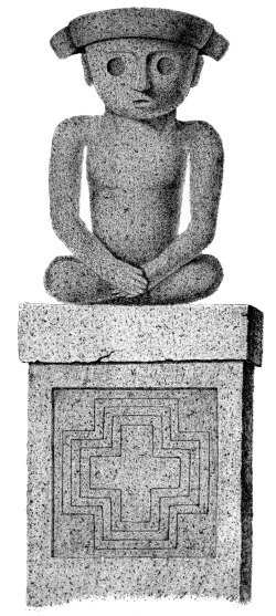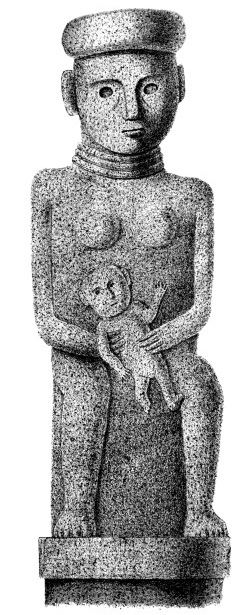 Female, sitting figure, with a child in its lap. It has probably stood insulated, as the back portions were pretty well elaborated, and, besides, the pedestal was adorned with a free border, which was not the case in any of the statues remaining in the circumference of the mound 1. This statue was, more-over, remarkable by its large head, not being turned straight forward, but somewhat upwards and side-ways. The statue was rudely executed, far inferior in workmanship to most of those mentioned before. There was no attempt at imitating the muscles of the body; the arms and legs were thin and short, not detached from [Pg 30] the block. It was only in the molding of the face that some endeavours to follow nature were to be detected; the eyes were formed by deep, oval cavities; the nostrils and cheeks were indicated; the mouth was closed, with thick lips; the ears were very large and projecting. The short, vigorous neck was ornamented by a broad neck-lace, formed of three round bands. The head was covered by a turban-shaped head-dress. The right shoulder was somewhat higher than the left. On the front of the body only the two semi-spherical breasts were elaborated; with this exception, the chest and abdomen were on a line with the block itself. The figure held before it a child or a smaller figure with very large head, large, projecting ears, clumsy body, and short, thin legs. In execution this statue strongly reminded of the figure η from Punta de las Figuras, though it was superior with regard to the face. It was found near the mound 3, but not in its periphery. The height of the statue from the upper edge of the turban to the upper edge of the pedestal was 170 cm. The length of the face from the lower edge of the turban was 34 cm. The breadth across the shoulders was 60 cm. The length of the smaller figure was 51 cm.