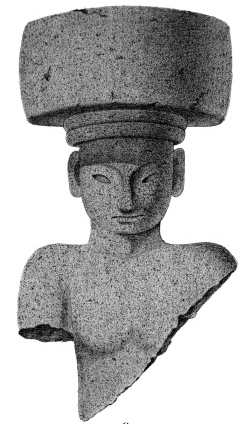 Female, standing figure. It reminded somewhat of the preceding one, but was much better executed. It certainly had a free position, as the back and shoulders were well sculptured. It carried on its head a very large, round, thick slab of stone, between which and the head there was a kind of turban, made of two round rolls. The face was unusually broad, and particularly remarkable in that respect that the eyes were placed obliquely. It was the only statue in which such was the case. The nose was large, straight; the mouth broad, closed; the ears very large, prominent, the left one longer than the right one. The shoulders and breast were pretty well elaborated. The lower portions were broken in many pieces. The diameter of the slab on the head was 72 cm.; its thickness 45 cm. The length of the face from the lower edge of the turban was 32 cm., its breadth 31 cm. The breadth across the shoulders was 72 cm. The statue was found at the periphery of the mound 6. [Pg 31]