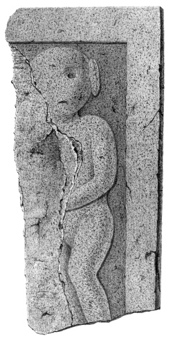 Male, standing figure. This statue did not belong to the same category with H, I and K, but had probably served as support in the wall of a building, because the turban-shaped head-dress was surmounted by a tenon, and the back was not elaborated. It had suffered so much from the violence of human hands, and from the effects of the climate, that its outlines could hardly be distinguished. From the upper edge of the tenon to the thighs it measured 123 cm. The length of the face was 24 cm. It was found immediately north of the mound 6.