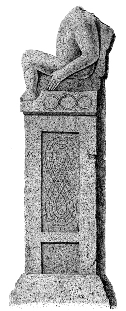Female, sitting with straight arms, the hands pressed against the stone seat in a posture just able to sustain the pressure of a heavy load. The head was wanting, but the well marked posture, as compared with that of the just described figure, seems to justify the conclusion that [Pg 29] this figure has also supported upon its head the large head of some animal. The entire figure was heavy and clumsy, but the circumstance of the muscles of the body being indicated both in front and behind, makes it not improbable that this statue has stood insulated, like K. The arms were quite detached from the body, and uncommonly thick and heavy, as were also the legs. The hands were heavily pressed against the block, on which the figure was seated, the right hand with the palm, the left one with the knuckles. The most remarkable feature of this statue was perhaps the bench on which it was seated; this was cut out from the block so as to be quite free and detached. The statue, like all above described ones, was sculptured from a single block, a monolith. The height of the statue from the shoulders to the upper edge of the pedestal was 107 cm. The breadth across the shoulders was 69 cm. It was found pretty close to the mound 4.
