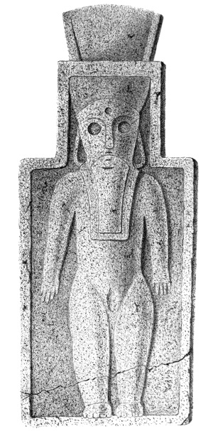 Male, standing figure, its head adorned by a high conical head-dress. Very like the figure F. Its face was hidden by a mask, with round holes for the eyes. It had a long, hanging beard or breast-armour. The arms were stretched straight down. It was broken in four fragments, and was found in the periphery of the mound 5.