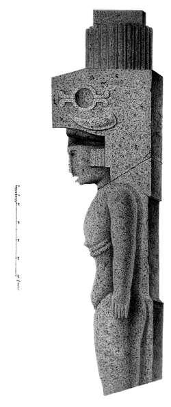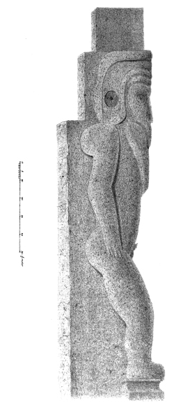 Female, standing figure, its head slightly bent forwards, and its arms hanging straight down. It was found erect, but imbedded in the earth to [Pg 16] the navel; the head was broken off, but was found close to the statue. The statue was very well sculptured, but not so carefully finished as the preceding one. The forehead was adorned with a low turban or round band, upon which was placed the heavy capital, with carvings in relief on the sides. The capital was surmounted by the square-shaped tenon, the lower part of which was surrounded by twenty staves with rounded tips. These ornaments seem to indicate, that in this statue, as well as in the former one, which was adorned with a double frame, the lower part of the tenon has been visible, and only its uppermost portion inserted into the plate of the building. The face and chest were well preserved, although not so accurately rendered as in A. The mouth was half-open, the eyes were well marked, deep cut, the ears hidden by large, square, flat, and grooved pieces. The breasts were held up by a double, round band. The breadth across the shoulders was extraordinarily great. The shoulders were high and thin, the arms very short and feeble in proportion to the body, not entirely detached, but much more so than in A. The length of the statue from the upper edge of the tenon to the knee was 226 cm., the breadth across the shoulders 66 cm.; the length of the tenon 34 cm.