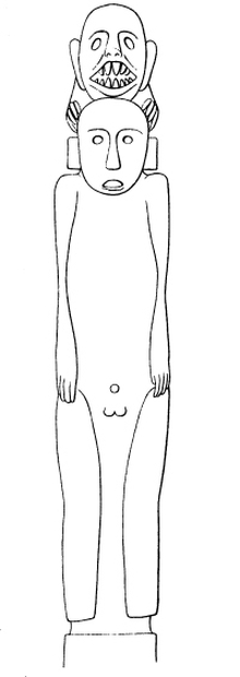 It was of the same kind as G, i. e. representing a human figure, on whose shoulders and head an animal was seated. It was much damaged, and [Pg 24] almost impossible to delineate. The anterior portion of the animal’s head was crushed, as were also the legs and arms of the human image, whose face seemed designed to represent a skull with a long neck. The face of the principal figure was 21 cm. long. The length of the animal from the crown of the head to the root of the tail was 50 cm. The legs and claws of this animal were larger than those of the monkey in G.