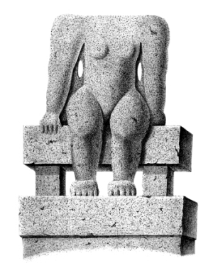 Female, sitting with straight arms, the hands pressed against the stone seat in a posture just able to sustain the pressure of a heavy load. The head was wanting, but the well marked posture, as compared with that of the just described figure, seems to justify the conclusion that [Pg 29] this figure has also supported upon its head the large head of some animal. The entire figure was heavy and clumsy, but the circumstance of the muscles of the body being indicated both in front and behind, makes it not improbable that this statue has stood insulated, like K. The arms were quite detached from the body, and uncommonly thick and heavy, as were also the legs. The hands were heavily pressed against the block, on which the figure was seated, the right hand with the palm, the left one with the knuckles. The most remarkable feature of this statue was perhaps the bench on which it was seated; this was cut out from the block so as to be quite free and detached. The statue, like all above described ones, was sculptured from a single block, a monolith. The height of the statue from the shoulders to the upper edge of the pedestal was 107 cm. The breadth across the shoulders was 69 cm. It was found pretty close to the mound 4.