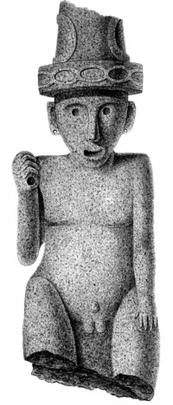 Female, sitting figure, with a child in its lap. It has probably stood insulated, as the back portions were pretty well elaborated, and, besides, the pedestal was adorned with a free border, which was not the case in any of the statues remaining in the circumference of the mound 1. This statue was, more-over, remarkable by its large head, not being turned straight forward, but somewhat upwards and side-ways. The statue was rudely executed, far inferior in workmanship to most of those mentioned before. There was no attempt at imitating the muscles of the body; the arms and legs were thin and short, not detached from [Pg 30] the block. It was only in the molding of the face that some endeavours to follow nature were to be detected; the eyes were formed by deep, oval cavities; the nostrils and cheeks were indicated; the mouth was closed, with thick lips; the ears were very large and projecting. The short, vigorous neck was ornamented by a broad neck-lace, formed of three round bands. The head was covered by a turban-shaped head-dress. The right shoulder was somewhat higher than the left. On the front of the body only the two semi-spherical breasts were elaborated; with this exception, the chest and abdomen were on a line with the block itself. The figure held before it a child or a smaller figure with very large head, large, projecting ears, clumsy body, and short, thin legs. In execution this statue strongly reminded of the figure η from Punta de las Figuras, though it was superior with regard to the face. It was found near the mound 3, but not in its periphery. The height of the statue from the upper edge of the turban to the upper edge of the pedestal was 170 cm. The length of the face from the lower edge of the turban was 34 cm. The breadth across the shoulders was 60 cm. The length of the smaller figure was 51 cm.