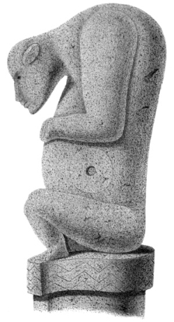 This statue, a double figure, was dug up out of the ground between the mounds 1 and 2. It has probably stood free, because considerable portions of its back were well elaborated. It is quite evident, that it [Pg 23] has not served to support a roof, as the upper part of the head of the upper figure wanted every trace of a tenon, and was carefully finished. It represented a male figure, somewhat stooping, with bent arms, the hands leaning on the hips. Upon this human figure that of an animal was seated, embracing with its fore-paws the head of the male figure. The animal was probably intended to represent a monkey. The male figure had an ugly face, with a long straight nose; the eyes were formed by quite circular cavities, the mouth was widely open, and the chin very short. The ears were covered by thick, square, flat pieces, as in the image B. The neck was long, the shoulders were much raised, large and powerful; the arms were bent, pressed close to the sides of the body, very narrow when seen from the front, broad and flat when seen side-ways. The chest and stomach were pretty roughly worked; the muscles however were sharply marked. The legs were short, without any trace of muscles or even of knees. The feet were completely wanting, the legs being abruptly cut off. The second figure, the monkey, rested its lower jaw upon the head of the principal figure, clasping the hind part of it with its long fingers. The head was large, with prominent muzzle and jaws, low, curved forehead, and broad nose, with round nostrils. The hanging ears were long and broad, rounded backwards. The mouth was open, showing strong, sharp teeth. The fore-legs or arms were very long, the fore-arm was bent at a right angle to the upper arm, the shoulder-blades were very broad and powerful. The back was strongly curved inwards, the tail long, longer than the animal itself, hanging straight down. The hind legs were short, strongly bent, drawn up towards the abdomen, and abruptly cut off above the feet, as in the principal figure. The length of the statue from the top of the animal’s head to the upper edge of the pedestal was 175 cm. The breadth of the human figure across the shoulders was 31 cm.; the breadth of the monkey across the shoulders was 21 cm.
