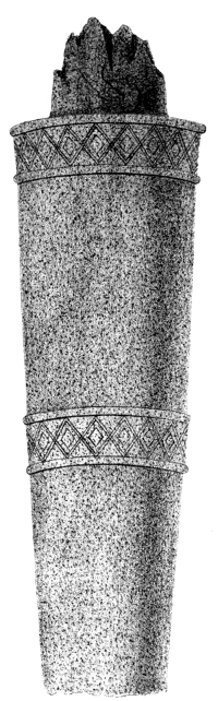 Contrary to the other images of this mound, indeed, of this whole locality, it did not represent a human figure, but formed a square pillar, provided with carvings on its front side. It carried a narrower superstructure (tenon), bordered in front by a sharp-cut frame, 6 cm. broad, 3 cm. deep. The carvings on the front side of the pillar itself consisted of wreaths somewhat more than 2 cm. deep with a breadth varying from 3 to 5 cm. They appeared to represent the head of an animal with an eye surrounded by two concentric circles. The sides of the pillar were narrower, smooth, without any traces of wreaths, but bordered by a square-cut frame, 6 cm. broad and 3 cm. deep. The back of the pillar, which was turned towards the building, was rough, without any frame. The front side was provided with a frame only above, and along the eastern side. The front side of the pillar was 50 cm. broad, the lateral sides 37 cm. broad. The tenon was 40 cm. in height by 38 cm. in breadth. The pillar was so deeply imbedded in the ground, that in spite of our digging strenuously, I did not succeed to lay bare more than about 125 cm. of its length, reckoned from the upper edge of the tenon. [Pg 19]